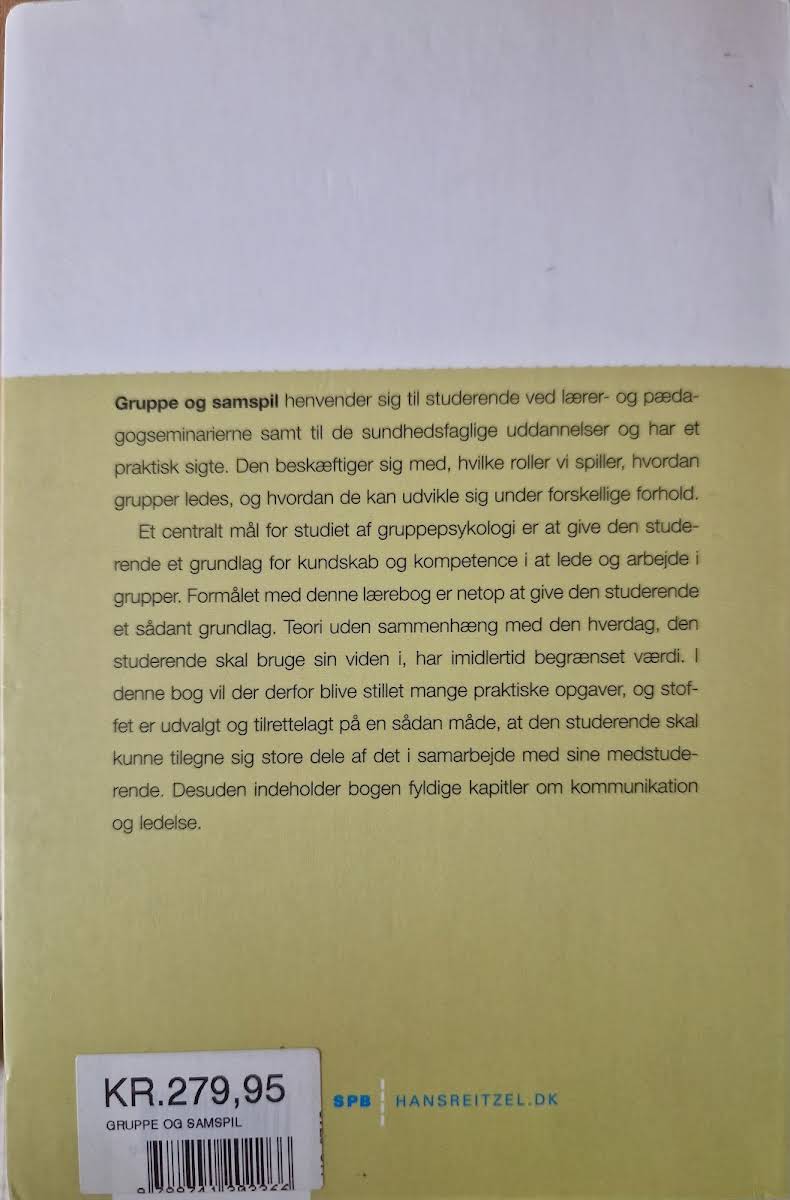 Gruppe og samspil er nu udgivet i en ny og gennemarbejdet udgave, der gør den særligt velegnet til studerende på lærer- og pædagogseminarier samt inden for de sundhedsfaglige uddannelser. Bogen belyser de forskellige roller, vi indtager i en gruppe, hvordan lederskab udfolder sig, og på hvilken måde grupper kan udvikle sig under skiftende forhold. Med et tydeligt praktisk sigte er formålet med lærebogen at give den studerende et solidt grundlag i gruppepsykologi og ledelse. Det teoretiske stof bliver præsenteret i tæt relation til de daglige udfordringer, man møder, og understøttes af mange praktiske opgaver, der fremmer samarbejdet mellem studerende. Yderligere beriges indholdet af veludviklede kapitler om kommunikation og ledelse, hvilket understreger bogens alsidige tilgang til emnet.