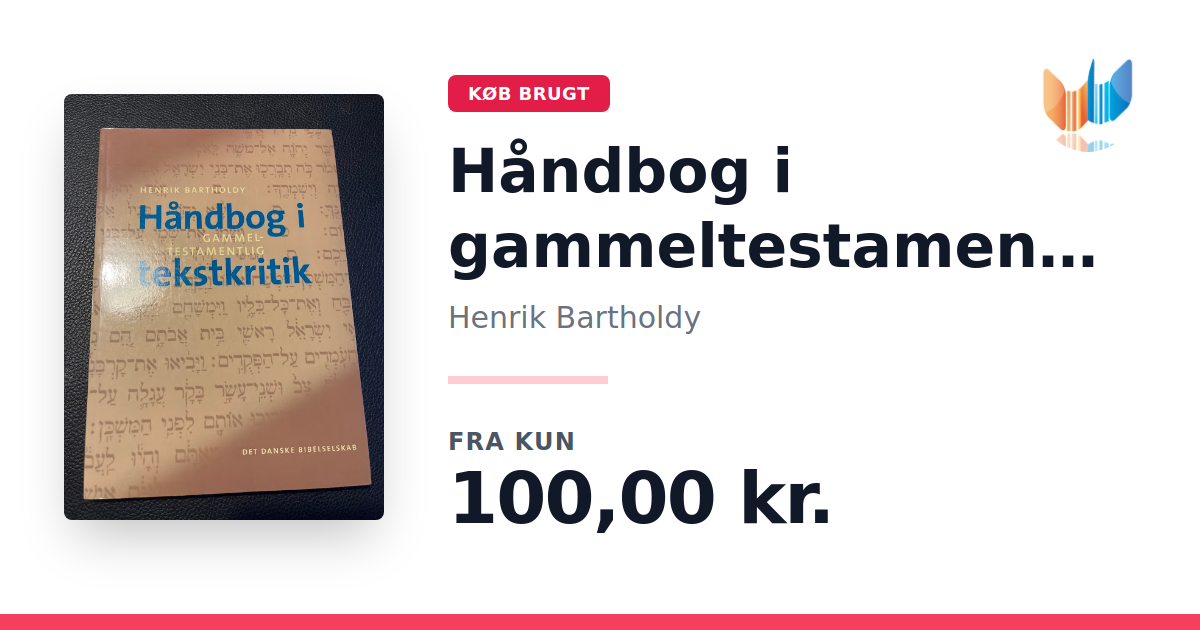 Lige nu kan du købe "Håndbog i gammeltestamentlig tekstkritik" af Henrik Bartholdy til kun 100,00 kr. Bogen du ser her er brugt, og i perfekt stand. Vi har i øjeblikket kun et enkelt eksemplar til salg af "Håndbog i gammeltestamentlig tekstkritik", så slå til mens du kan!