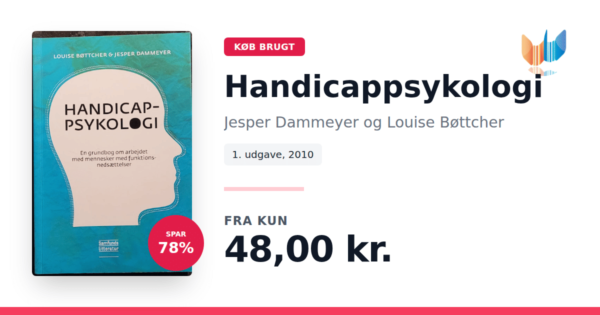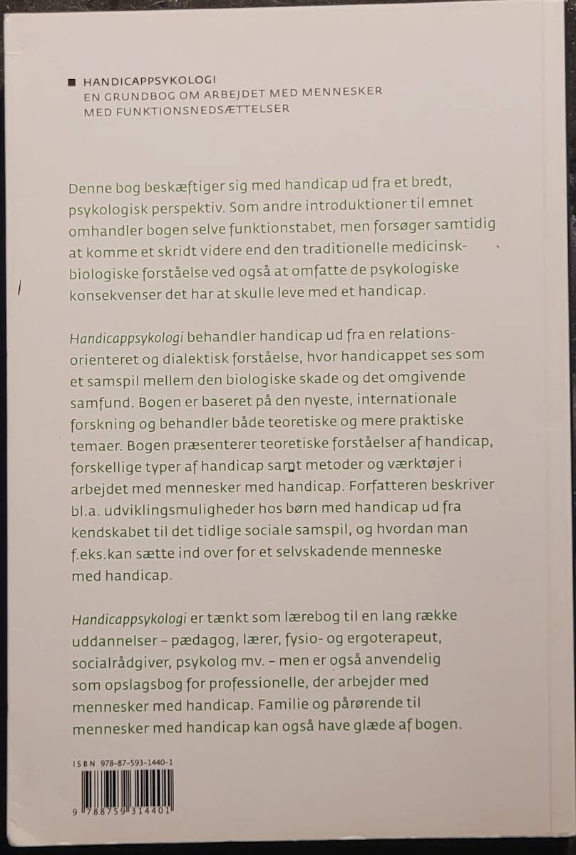 "Handicappsykologi" giver et indsigtsfuldt overblik over handicap, hvor Jesper Dammeyer og Louise Bøttcher kombinerer den medicinsk-biologiske tilgang med et dybt psykologisk perspektiv. Bogen undersøger, hvordan funktionstabet påvirker den enkelte og de psykologiske konsekvenser, der følger med både fysiske og psykiske udfordringer. Med udgangspunkt i den nyeste internationale forskning præsenterer forfatterne en relationsorienteret og dialektisk forståelse af handicap. De illustrerer, hvordan samspillet mellem den individuelle skade og de omstændigheder, vi lever i, former oplevelsen af at have et handicap. Denne grundbog giver læseren både teoretiske indsigter og praktiske perspektiver i håndteringen af funktionsnedsættelser.