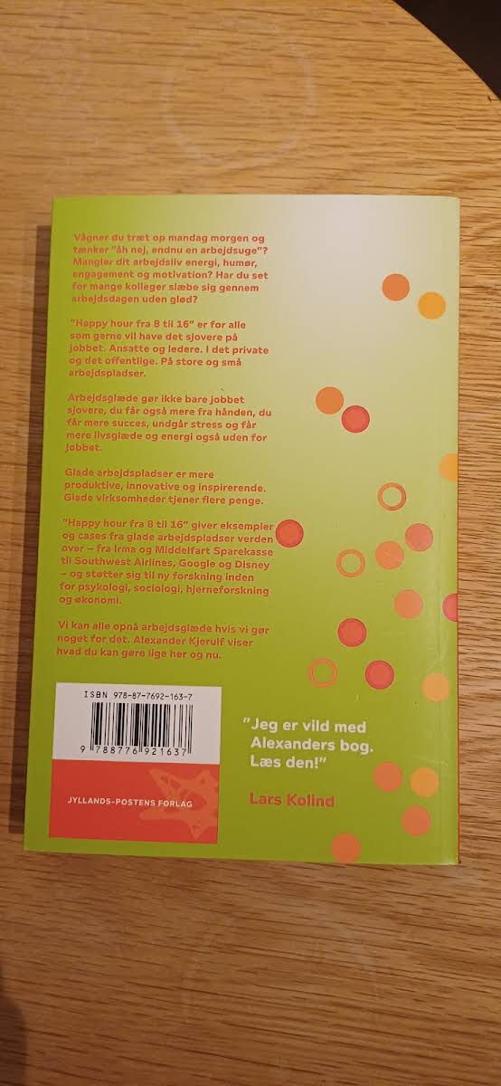 Lige nu kan du købe "Happy hour fra 8 til 16" af Alexander Kjerulf til kun 75,00 kr. Du sparer hele 55% af nyprisen! Bogen du ser her er brugt, og i perfekt stand. Vi har i øjeblikket kun et enkelt eksemplar til salg af "Happy hour fra 8 til 16", så slå til mens du kan!