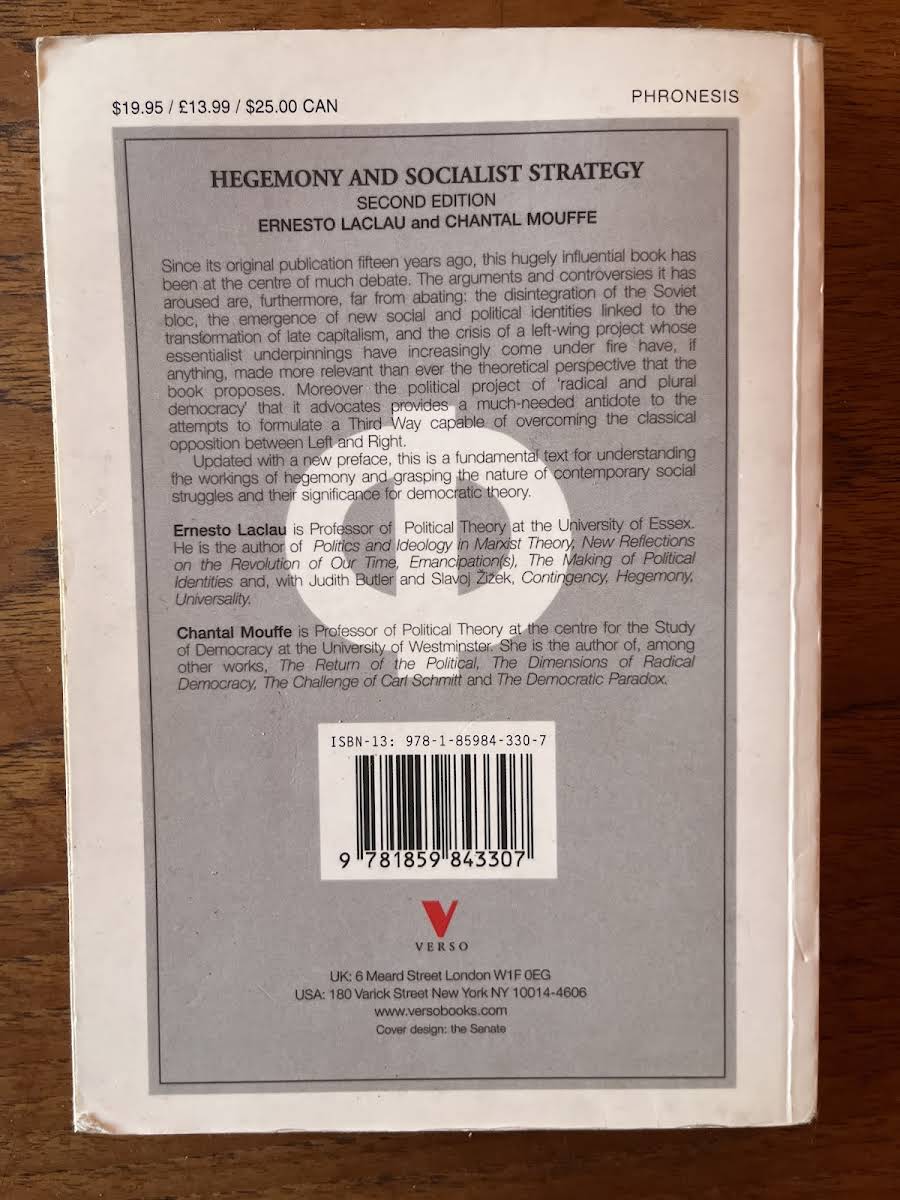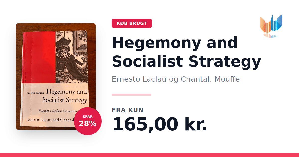 Hegemony and Socialist Strategy: Towards a Radical Democratic Politics af Ernesto Laclau og Chantal Mouffe har siden sin første udgivelse for femten år siden udløst omfattende debat om politisk teori og praksis. Opløsningen af Sovjetblokken, fremvæksten af nye sociale og politiske identiteter under senkapitalismens omvæltninger og venstreprojektets krise med dets essentialistiske udgangspunkter har tværtimod gjort bogens teoretiske perspektiv mere presserende end nogensinde. Forfatterne præsenterer visionen om et ‘radikalt og pluralistisk demokrati’ som et nødvendigt modspil til bestræbelserne på at formulere en Tredje Vej, der skal udviske de klassiske modsætninger mellem venstre og højre. Denne 2. udgave, opdateret med et nyt forord, er en grundlæggende tekst til at forstå hegemoniens mekanismer og til at indfange betydningen af nutidige sociale kampe for demokratiteoriens fremtid.