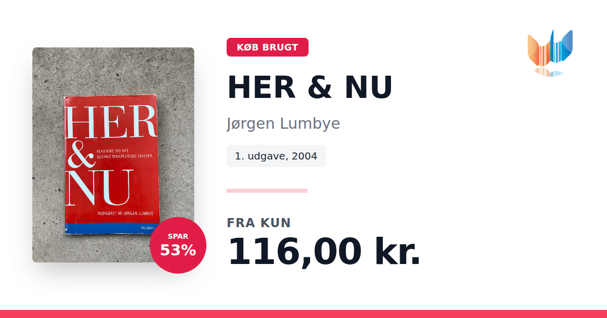 Lige nu kan du købe "HER & NU" af Jørgen Lumbye til kun 116,00 kr. Du sparer hele 53% af nyprisen! Bogen du ser her er brugt, og i god stand. Vi har i øjeblikket kun et enkelt eksemplar til salg af "HER & NU", så slå til mens du kan!