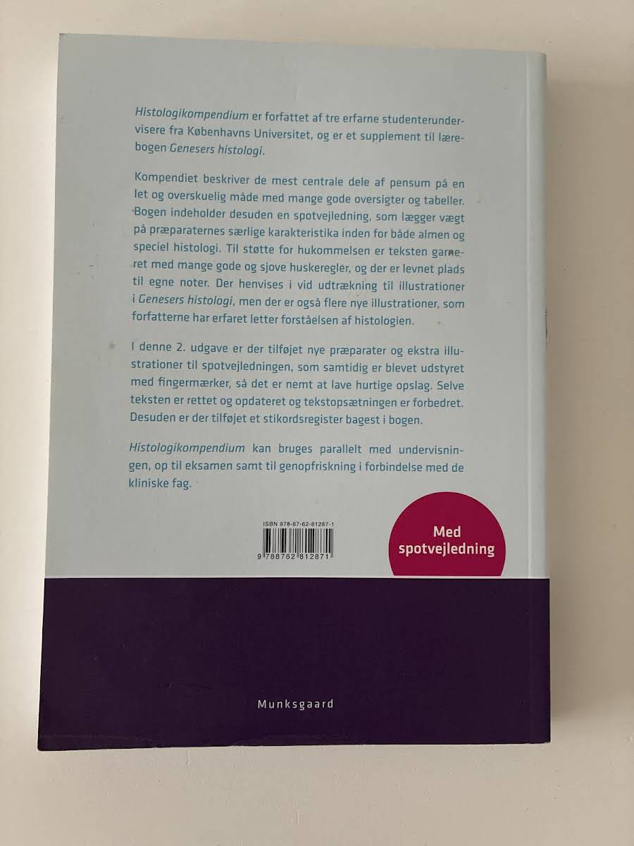 Histologi kompendium er et værdifuldt supplement til Genesers histologi og er designet til at gøre undervisningen endnu mere tilgængelig og overskuelig. Bogen er opbygget således, at den spejler kapitelstrukturen i Genesers histologi, og henviser løbende til relevante figurer for at forstærke den studerendes forståelse af vævenes opbygning og funktion. De tre medforfattere, Anders Rehfeld, Kirstine Kim Schmidt Karnov og Malin Nylander, er alle medicinstuderende med praktisk undervisningserfaring i histologi, hvilket afspejler sig i kompendiets anvendelige og studienære opbygning. Kompendiet indeholder en spotvejledning, som hjælper med genkendelsen af de enkelte histologiske præparater i både almen- og specielhistologi, og er derfor et uundværligt redskab både i relation til underviseren og den studerende.