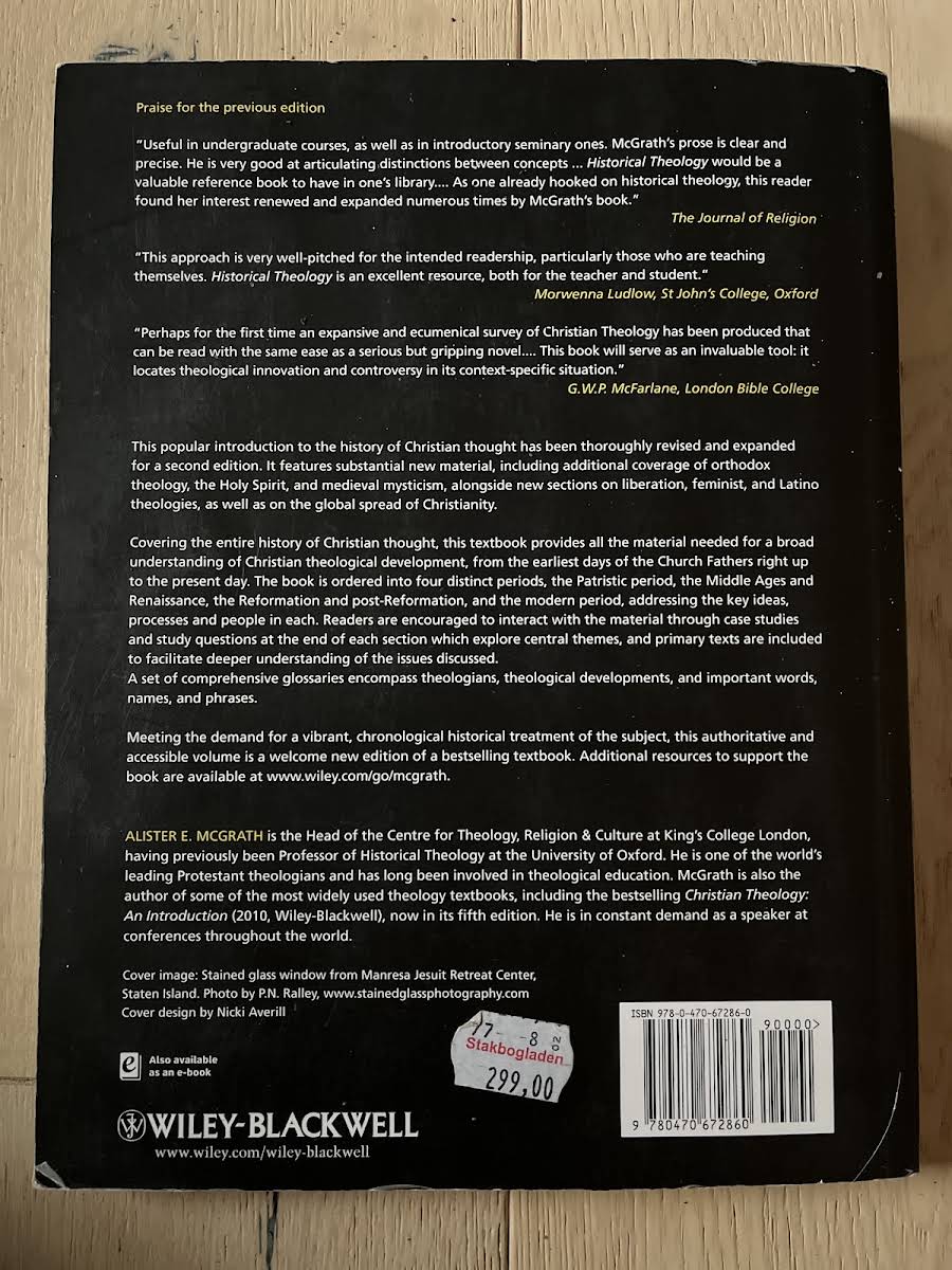 Historical Theology: An Introduction to the History of Christian Thought (2. udgave, 2012) er en autoritativ indføring i udviklingen af kristen teologi fra de tidlige kirkelige fædre til moderne tid. Alister E. McGrath præsenterer omfattende nyt materiale, der giver læseren en solid forståelse af de vigtigste strømninger og tanker gennem 320 sider. Bogen er inddelt i fire hovedafsnit: den patristiske periode, middelalderen og renæssancen, reformationen og efterreformationen samt den moderne æra fra ca. 1750 frem til i dag. Hvert afsnit kombinerer historisk overblik med analyser af centrale spørgsmål og skikkelser, så både studerende og interesserede læsere får et klart billede af teologiens kontinuerlige udvikling. Anden udgave rummer nye kapitler om ortodoks teologi, Helligånden og middelaldermystik samt udvidede afsnit om frigørelsesteologier, feministisk og latinoteologi. Der lægges også vægt på kristendommens globale udbredelse og indflydelse. Afslutningsvis indeholder bogen case-studier og udvalgte primærtekster i slutningen af hvert afsnit, ligesom et omfattende glossar med nøglepersoner, begreber og udviklinger sikrer overblik og dybdegående forståelse.