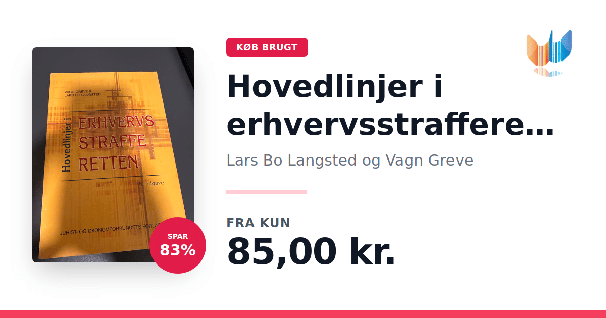 Lige nu kan du købe "Hovedlinjer i erhvervsstrafferetten" af Lars Bo Langsted og Vagn Greve til kun 85,00 kr. Du sparer hele 83% af nyprisen! Bogen du ser her er brugt, og i god stand. Vi har i øjeblikket kun et enkelt eksemplar til salg af "Hovedlinjer i erhvervsstrafferetten", så slå til mens du kan!