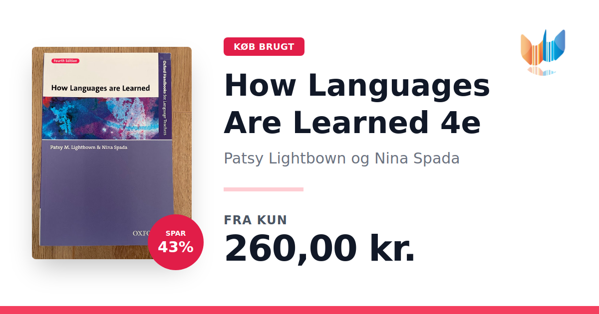 How Languages Are Learned 4. udgave af Patsy Lightbown og Nina Spada er en grundigt opdateret og let tilgængelig indføring i sprogtilegnelse, udgivet i 2013 af Oxford University Press som paperback. Bogen præsenterer centrale teorier og koncepter, der forklarer, hvordan sprog indlæres, og giver læseren et klart overblik over både historiske og nyere forskningsresultater. Med fokus på at bygge bro mellem teori og praksis trækker forfatterne konsekvente pædagogiske implikationer ud af forskningen og viser, hvordan disse kan anvendes direkte i klasseværelset. Denne 304-siders håndbog er uundværlig både for studerende på læreruddannelser og for nye såvel som erfarne undervisere, der ønsker at styrke deres sprogtilegnelsesundervisning.