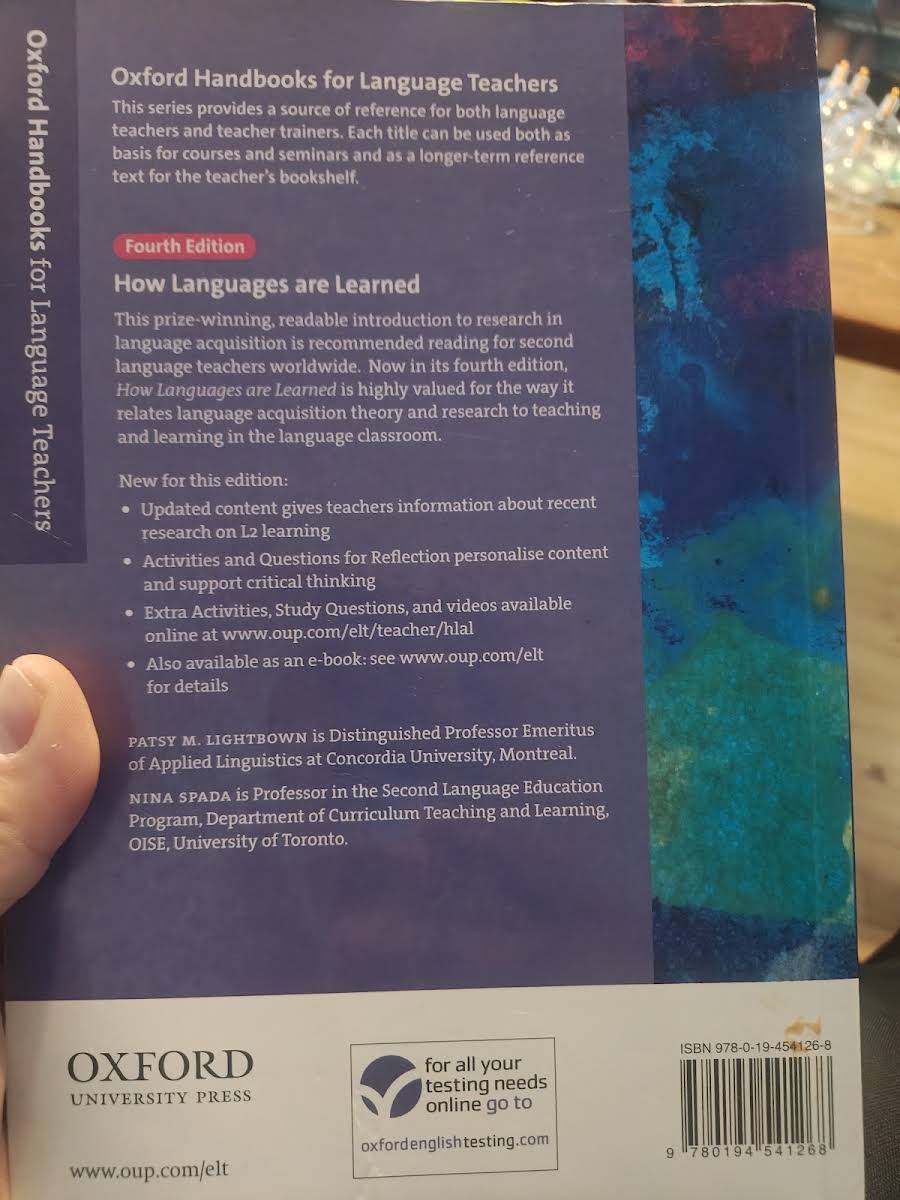 How Languages Are Learned 4. udgave af Patsy Lightbown og Nina Spada er en grundigt opdateret og let tilgængelig indføring i sprogtilegnelse, udgivet i 2013 af Oxford University Press som paperback. Bogen præsenterer centrale teorier og koncepter, der forklarer, hvordan sprog indlæres, og giver læseren et klart overblik over både historiske og nyere forskningsresultater. Med fokus på at bygge bro mellem teori og praksis trækker forfatterne konsekvente pædagogiske implikationer ud af forskningen og viser, hvordan disse kan anvendes direkte i klasseværelset. Denne 304-siders håndbog er uundværlig både for studerende på læreruddannelser og for nye såvel som erfarne undervisere, der ønsker at styrke deres sprogtilegnelsesundervisning.