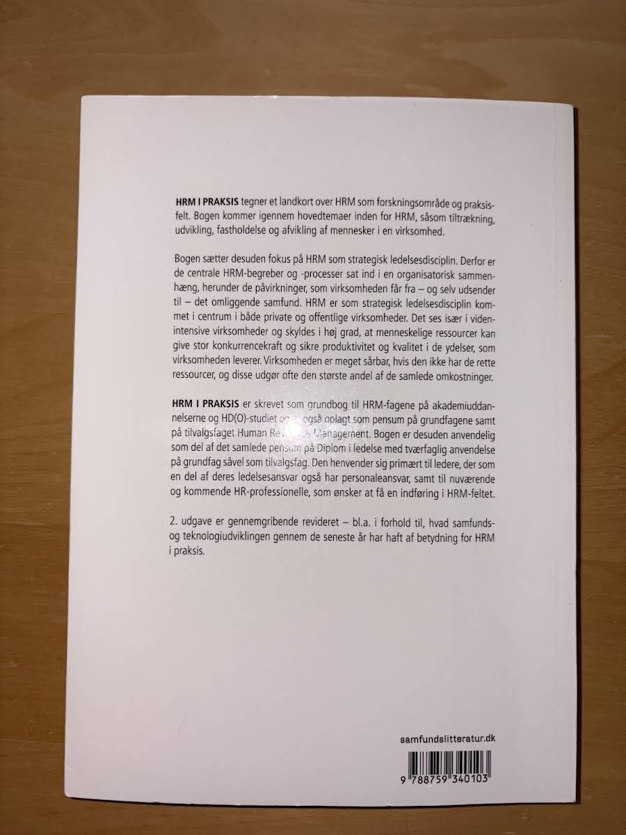HRM i praksis giver et overskueligt overblik over HRM som både forskningsområde og praktisk disciplin. Bogen gennemgår centrale temaer såsom tiltrækning, udvikling, fastholdelse og afvikling af medarbejdere og sætter fokus på HRM's rolle som en strategisk ledelsesdisciplin. De centrale HRM-begreber og processer sættes ind i deres organisatoriske kontekst med vægt på de påvirkninger, som både virksomheden modtager fra og udsender til samfundet. Anden udgave af bogen er gennemgribende opdateret med henblik på den samfunds- og teknologiske udvikling de seneste år har medført. Den er udformet som grundbog til HRM-fagene på akademiuddannelserne samt HD(O)-studiet og er et oplagt pensumvalg for både grundfag og tilvalgsfaget Human Resources Management. Bogen henvender sig til ledere med personaleansvar samt til nuværende og kommende HR-professionelle, som ønsker en solid indføring i HRM-feltet.