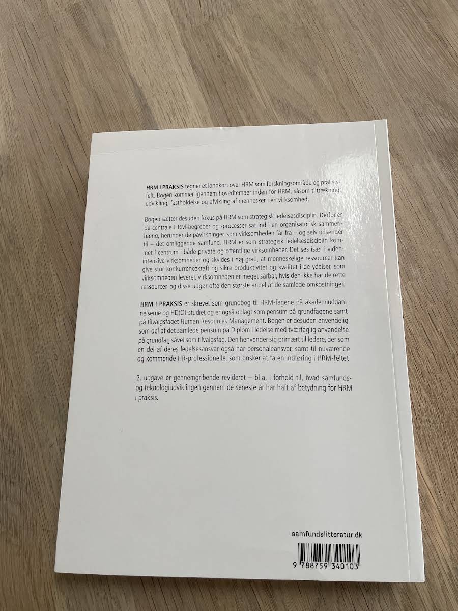 HRM i praksis giver et overskueligt overblik over HRM som både forskningsområde og praktisk disciplin. Bogen gennemgår centrale temaer såsom tiltrækning, udvikling, fastholdelse og afvikling af medarbejdere og sætter fokus på HRM's rolle som en strategisk ledelsesdisciplin. De centrale HRM-begreber og processer sættes ind i deres organisatoriske kontekst med vægt på de påvirkninger, som både virksomheden modtager fra og udsender til samfundet. Anden udgave af bogen er gennemgribende opdateret med henblik på den samfunds- og teknologiske udvikling de seneste år har medført. Den er udformet som grundbog til HRM-fagene på akademiuddannelserne samt HD(O)-studiet og er et oplagt pensumvalg for både grundfag og tilvalgsfaget Human Resources Management. Bogen henvender sig til ledere med personaleansvar samt til nuværende og kommende HR-professionelle, som ønsker en solid indføring i HRM-feltet.