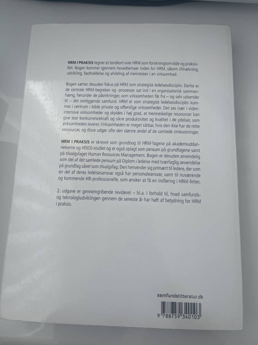 HRM i praksis giver et overskueligt overblik over HRM som både forskningsområde og praktisk disciplin. Bogen gennemgår centrale temaer såsom tiltrækning, udvikling, fastholdelse og afvikling af medarbejdere og sætter fokus på HRM's rolle som en strategisk ledelsesdisciplin. De centrale HRM-begreber og processer sættes ind i deres organisatoriske kontekst med vægt på de påvirkninger, som både virksomheden modtager fra og udsender til samfundet. Anden udgave af bogen er gennemgribende opdateret med henblik på den samfunds- og teknologiske udvikling de seneste år har medført. Den er udformet som grundbog til HRM-fagene på akademiuddannelserne samt HD(O)-studiet og er et oplagt pensumvalg for både grundfag og tilvalgsfaget Human Resources Management. Bogen henvender sig til ledere med personaleansvar samt til nuværende og kommende HR-professionelle, som ønsker en solid indføring i HRM-feltet.