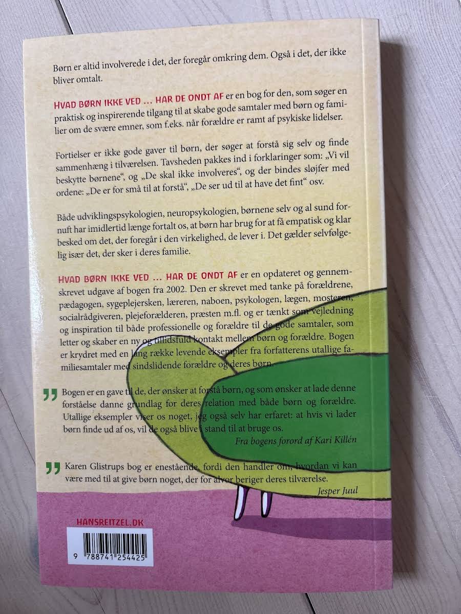 Hvad børn ikke ved … har de ondt af - Bryd tavsheden er en opdateret og gennemskrevet 3. udgave fra 2014 af Karen Glistrup. Gennem konkrete modeller og praksiseksempler viser bogen, hvordan voksne kan indlede de vanskelige samtaler, der skaber tryghed og tillid i familien. Med fokus på børns særlige behov i familier, hvor en forælder er psykisk syg, henvender teksten sig til forældre, pædagoger, sygeplejersker, lærere, psykologer, læger, socialrådgivere, plejeforældre, præster og naboer. De klare anvisninger kan let tilpasses forskellige faggrupper og familiekonstellationer. Karen Glistrup deler levende eksempler fra sine utallige familiesamtaler med sindslidende forældre og deres børn. Læseren får redskaber til at bryde tavsheden, åbne for ærlige dialoger og genoprette den tillidsfulde kontakt mellem børn og voksne. Udgivet af Hans Reitzels Forlag som paperback på 246 sider, er denne bog et uundværligt værktøj for alle, der ønsker at forstå børn bedre og styrke familiedialogen.