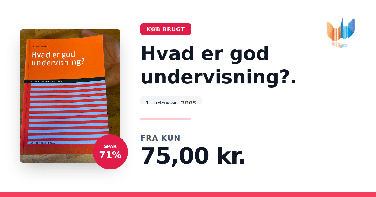 Lige nu kan du købe "Hvad er god undervisning?." til kun 75,00 kr. Du sparer hele 71% af nyprisen! Bogen du ser her er brugt, og i perfekt stand. Vi har i øjeblikket 4 eksemplarer til salg af "Hvad er god undervisning?.", så husk at se de forskellige udgaver.