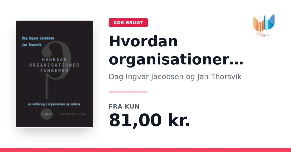 Lige nu kan du købe "Hvordan organisationer fungerer" af Dag Ingvar Jacobsen og Jan Thorsvik til kun 81,00 kr. Bogen du ser her er brugt, og i perfekt stand. Vi har i øjeblikket 10 eksemplarer til salg af "Hvordan organisationer fungerer", så husk at se de forskellige udgaver.