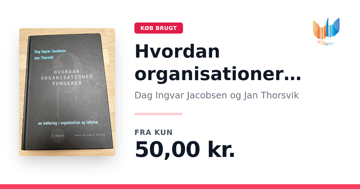 Lige nu kan du købe "Hvordan organisationer fungerer" af Dag Ingvar Jacobsen og Jan Thorsvik til kun 50,00 kr. Bogen du ser her er brugt, og i god stand. Vi har i øjeblikket 10 eksemplarer til salg af "Hvordan organisationer fungerer", så husk at se de forskellige udgaver.
