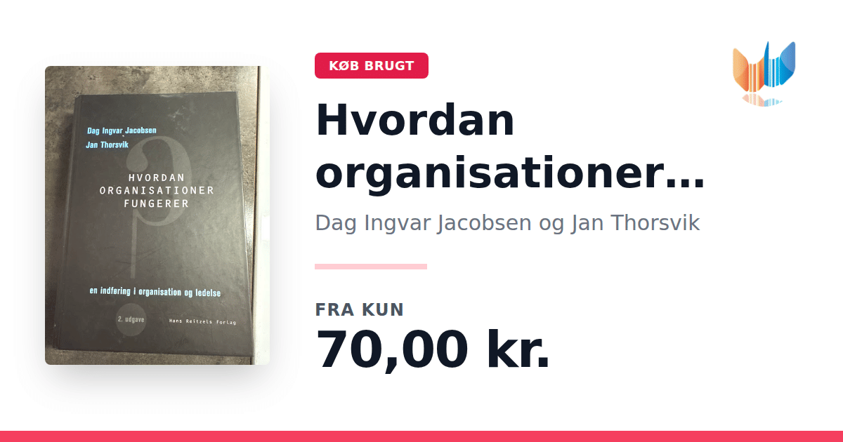 Lige nu kan du købe "Hvordan organisationer fungerer" af Dag Ingvar Jacobsen og Jan Thorsvik til kun 70,00 kr. Bogen du ser her er brugt, og i god stand. Vi har i øjeblikket 12 eksemplarer til salg af "Hvordan organisationer fungerer", så husk at se de forskellige udgaver.