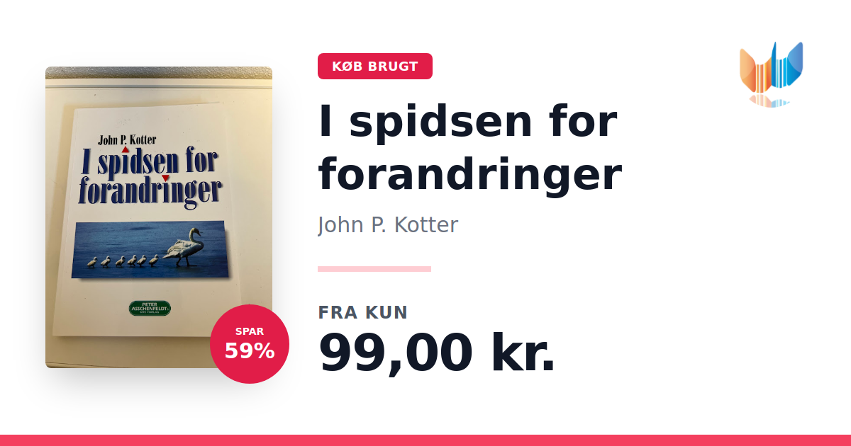 Lige nu kan du købe "I spidsen for forandringer" af John P. Kotter til kun 99,00 kr. Du sparer hele 59% af nyprisen! Bogen du ser her er brugt, og i perfekt stand. Vi har i øjeblikket 2 eksemplarer til salg af "I spidsen for forandringer", så husk at se de forskellige udgaver.