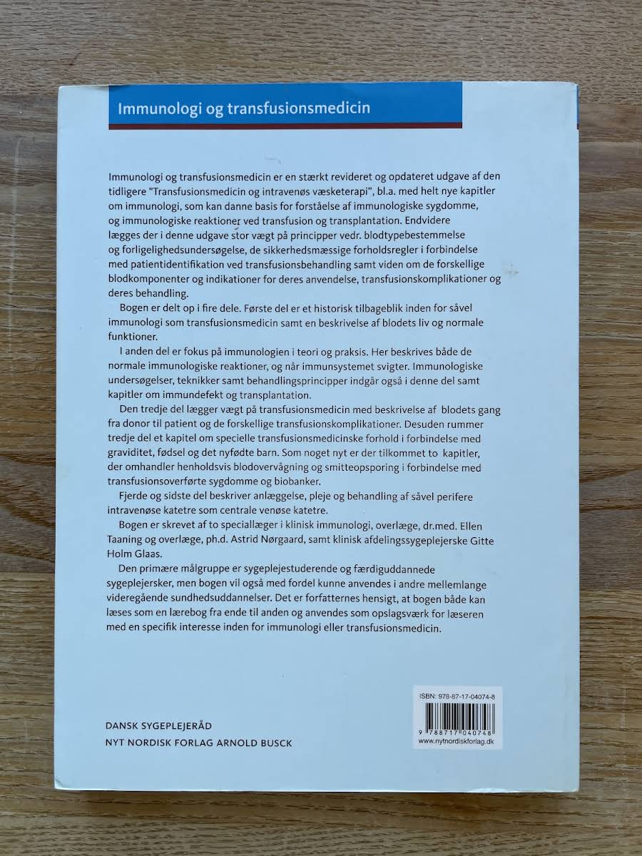 I "Immunologi og transfusionsmedicin" tilbydes en dybdegående indføring i de centrale principper inden for immunologi. Bogen fokuserer bl.a. på immunologiske sygdomme samt de komplekse reaktioner, der kan opstå i forbindelse med transfusion og transplantation. Der gives en grundig gennemgang af essentiels blodtypebestemmelse og kompatibilitetsundersøgelser, som understøtter den kliniske forståelse. Med forfatterne Gitte Holm Glaas, Astrid Birgitte Nørgaard og Ellen Birkerod Taaning som erfarne fagfolk på området, formidles viden, der er til gavn for både studerende og professionelle inden for sundhedssektoren. Denne første udgave fra 2010 er udarbejdet med henblik på at styrke fundamentet for sygeplejestuderende, uddannede sygeplejersker samt andre praktiserende inden for de videregående sundhedsuddannelser.