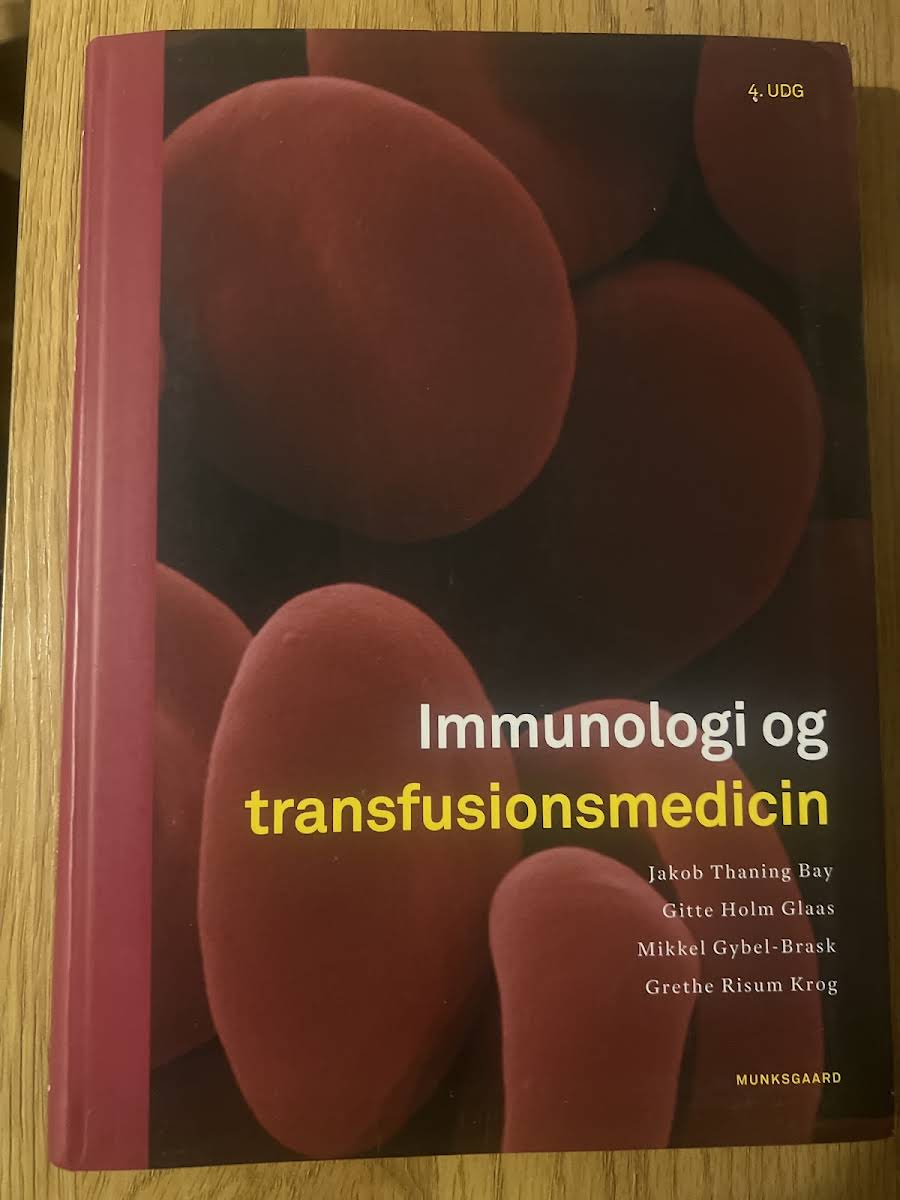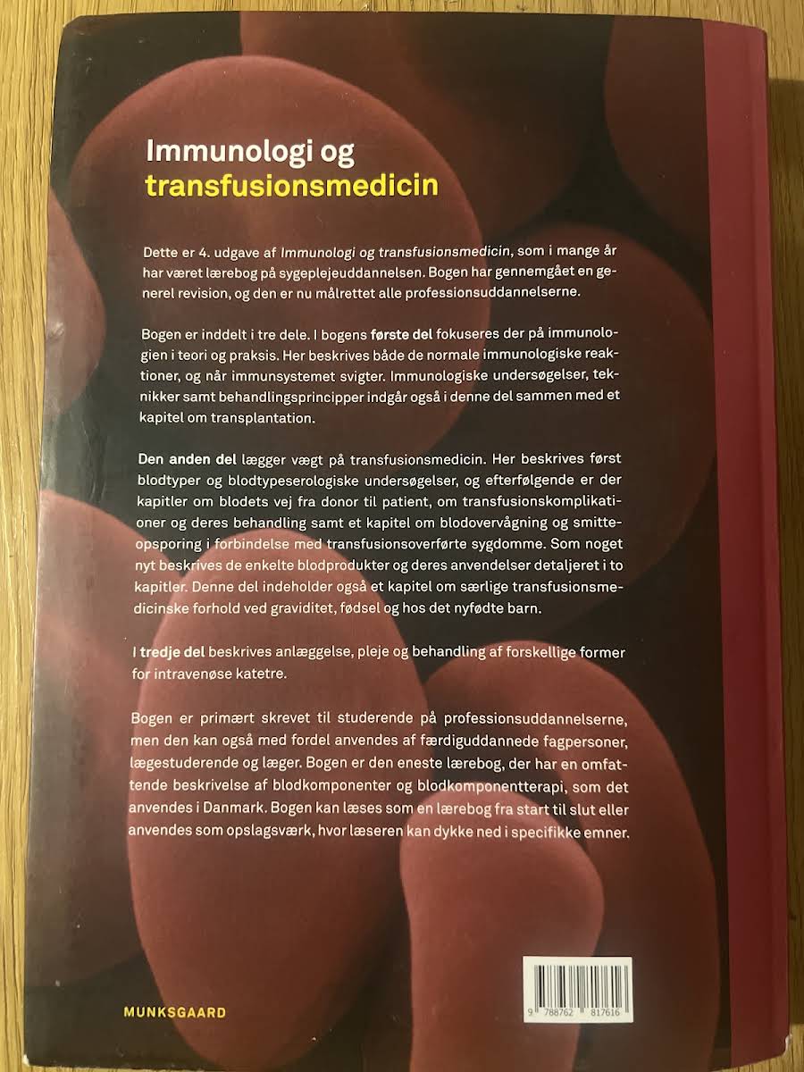 Den 4. udgave af Immunologi og transfusionsmedicin er en opdateret og gennemarbejdet lærebog, der henvender sig til studerende på en række professionsuddannelser samt praktiserende fagpersoner og lægestuderende. Bogen er udarbejdet af Jakob Thaning Bay, Gitte Holm Glaas, Grethe Risum Krog og Mikkel Gybel-Brask og repræsenterer en omfattende kilde til viden om både immunologi og transfusionsmedicin. Bogen er inddelt i tre dele. I den første del præsenteres immunologi i teori og praksis med fokus på både normale immunsvar og de situationer, hvor immunsystemet fejler. Kapitelindholdet omfatter immunologiske undersøgelsesmetoder, teknikker samt behandlingsstrategier – herunder aspekter ved transplantation. I den anden del lægges der vægt på transfusionsmedicin med redegørelser for blodtyper, serologiske metoder og den kliniske håndtering af transfusionskomplikationer. Der tilbydes desuden en detaljeret gennemgang af blodets vej fra donor til patient samt en præcis beskrivelse af de enkelte blodprodukter og deres kliniske anvendelser. Endelig fokuserer tredje del på anlæggelse, pleje og behandling af forskellige typer af intravenøse katetre. Med sin strukturerede opbygning og brede emneområde fungerer bogen både som en samlet lærebog og et værdifuldt opslagsværk, der opfylder behovet hos både studerende og etablerede fagfolk.