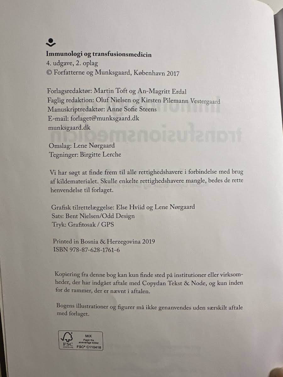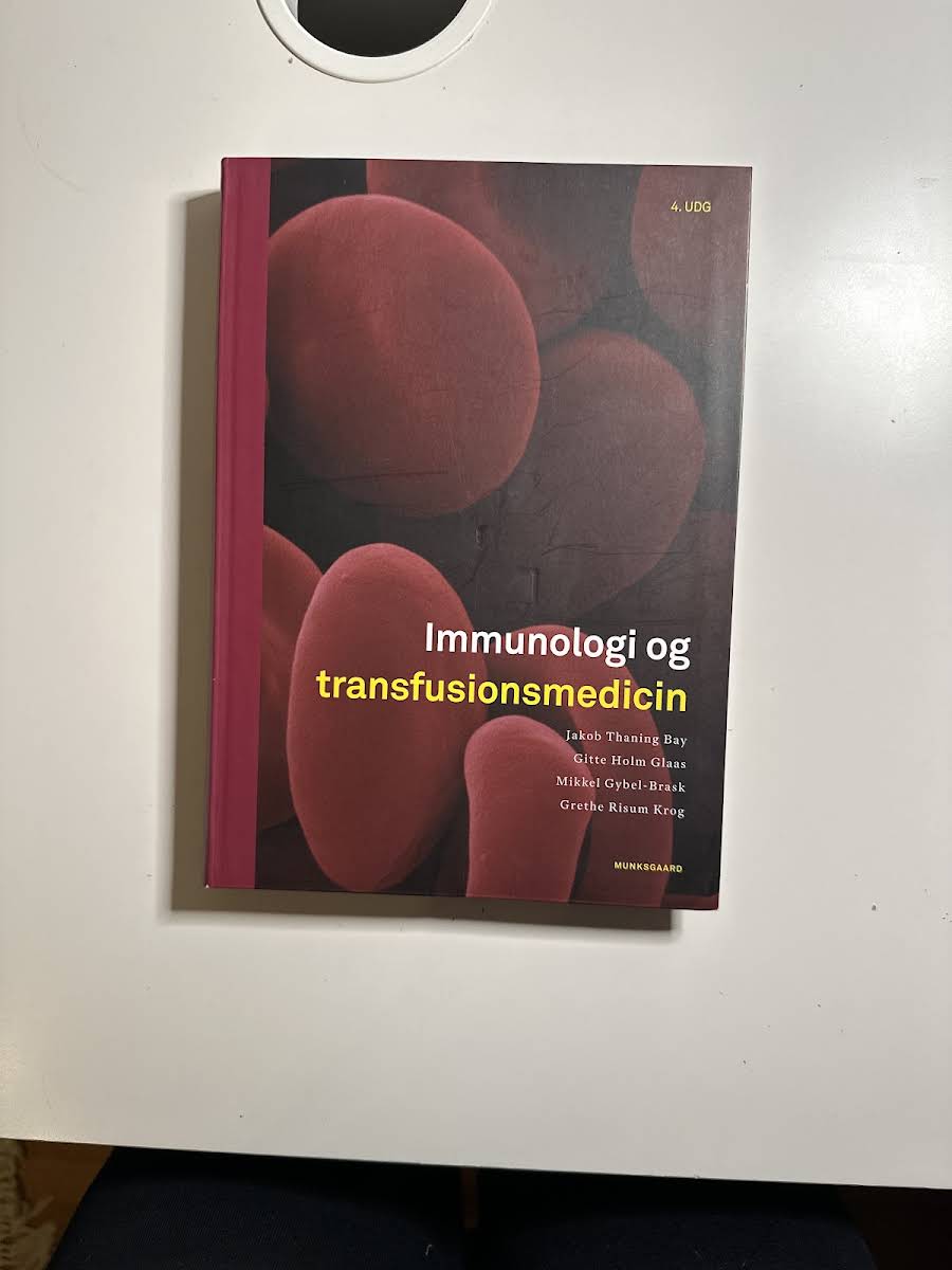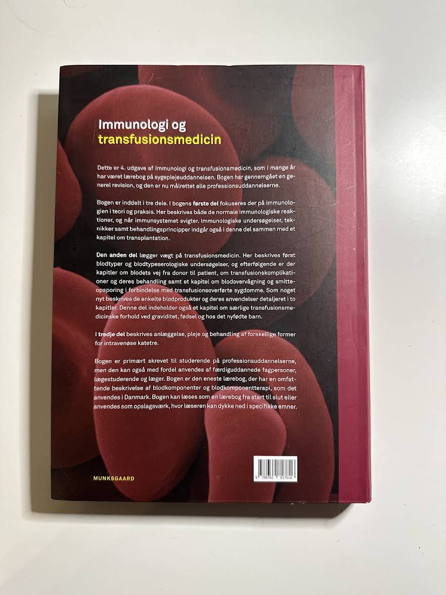 Den 4. udgave af Immunologi og transfusionsmedicin er en opdateret og gennemarbejdet lærebog, der henvender sig til studerende på en række professionsuddannelser samt praktiserende fagpersoner og lægestuderende. Bogen er udarbejdet af Jakob Thaning Bay, Gitte Holm Glaas, Grethe Risum Krog og Mikkel Gybel-Brask og repræsenterer en omfattende kilde til viden om både immunologi og transfusionsmedicin. Bogen er inddelt i tre dele. I den første del præsenteres immunologi i teori og praksis med fokus på både normale immunsvar og de situationer, hvor immunsystemet fejler. Kapitelindholdet omfatter immunologiske undersøgelsesmetoder, teknikker samt behandlingsstrategier – herunder aspekter ved transplantation. I den anden del lægges der vægt på transfusionsmedicin med redegørelser for blodtyper, serologiske metoder og den kliniske håndtering af transfusionskomplikationer. Der tilbydes desuden en detaljeret gennemgang af blodets vej fra donor til patient samt en præcis beskrivelse af de enkelte blodprodukter og deres kliniske anvendelser. Endelig fokuserer tredje del på anlæggelse, pleje og behandling af forskellige typer af intravenøse katetre. Med sin strukturerede opbygning og brede emneområde fungerer bogen både som en samlet lærebog og et værdifuldt opslagsværk, der opfylder behovet hos både studerende og etablerede fagfolk.