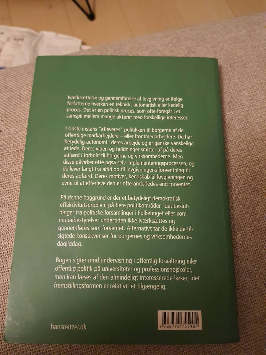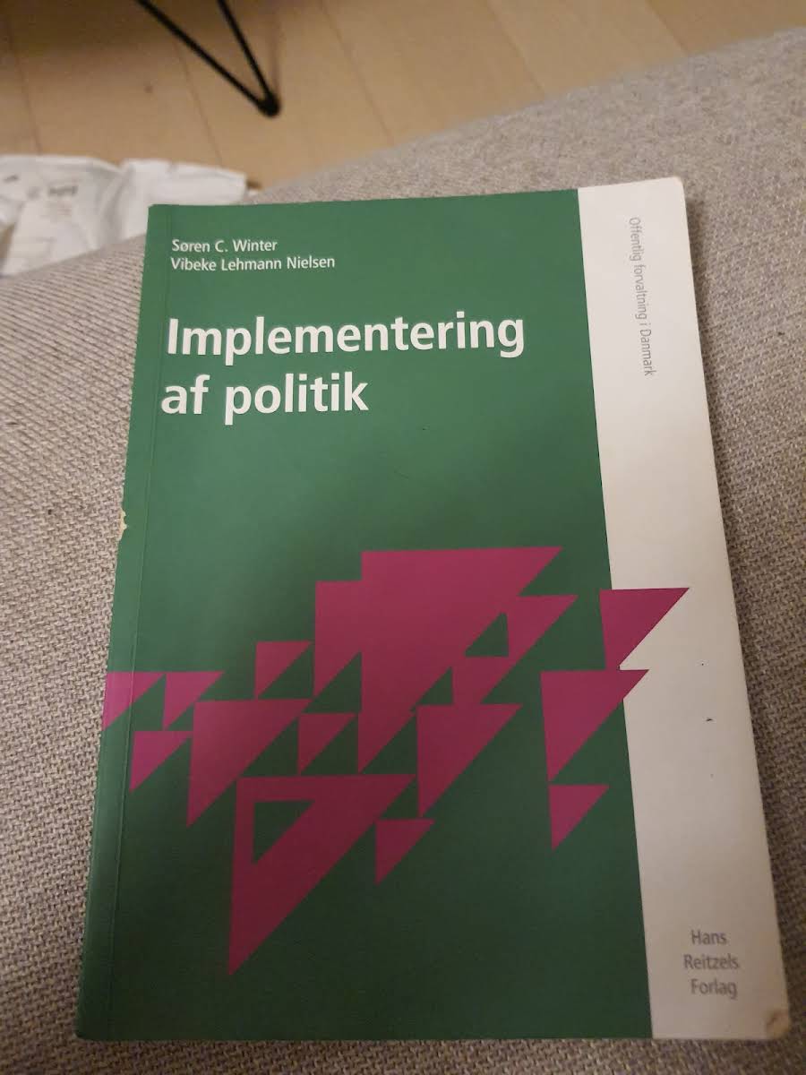 "Implementering af politik" giver en dybdegående introduktion til, hvordan offentlig politik omsættes til praksis gennem en lang række komplekse og ofte uforudsigelige processer. Bogen belyser, hvordan lovgivning og politiske beslutninger sjældent implementeres på en teknisk eller automatisk måde, men i stedet formes af de mange aktørers interesser og deres indbyrdes samspil. Forfatterne Søren C. Winter og Vibeke Lehmann Nielsen illustrerer, hvordan frontmedarbejdernes viden og holdninger får afgørende betydning for den endelige lovgivningspraksis, og hvordan den vanskelige ledelsesrolle over for disse frontlinjepersoner spiller en central rolle i implementeringsprocessen. Bogen henvender sig særligt til studerende med interesse for offentlig forvaltning og politik, der ønsker at opnå en nuanceret forståelse for de udfordringer og beslutningsprocesser, der følger med gennemførelsen af politiske tiltag.