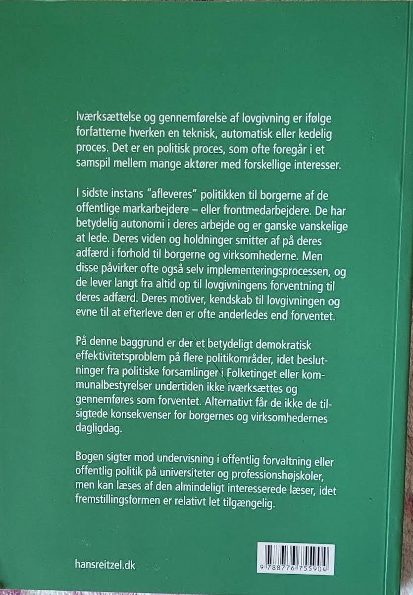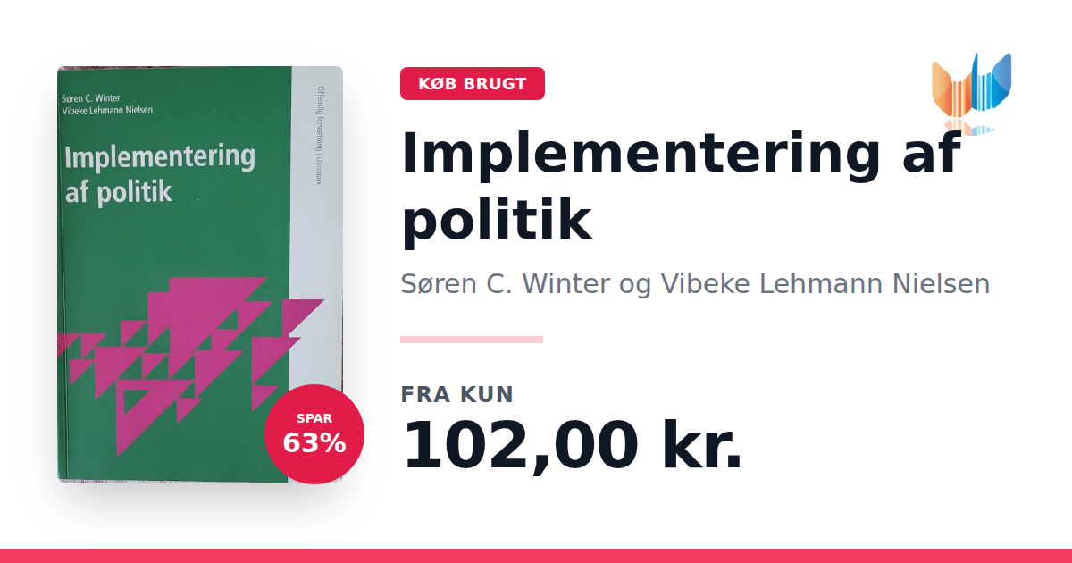 "Implementering af politik" giver en dybdegående introduktion til, hvordan offentlig politik omsættes til praksis gennem en lang række komplekse og ofte uforudsigelige processer. Bogen belyser, hvordan lovgivning og politiske beslutninger sjældent implementeres på en teknisk eller automatisk måde, men i stedet formes af de mange aktørers interesser og deres indbyrdes samspil. Forfatterne Søren C. Winter og Vibeke Lehmann Nielsen illustrerer, hvordan frontmedarbejdernes viden og holdninger får afgørende betydning for den endelige lovgivningspraksis, og hvordan den vanskelige ledelsesrolle over for disse frontlinjepersoner spiller en central rolle i implementeringsprocessen. Bogen henvender sig særligt til studerende med interesse for offentlig forvaltning og politik, der ønsker at opnå en nuanceret forståelse for de udfordringer og beslutningsprocesser, der følger med gennemførelsen af politiske tiltag.