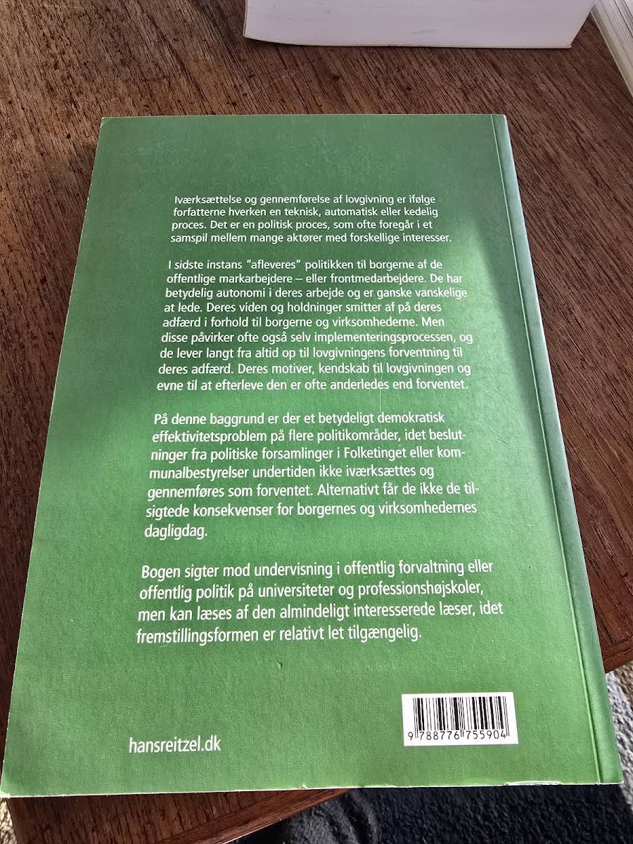"Implementering af politik" giver en dybdegående introduktion til, hvordan offentlig politik omsættes til praksis gennem en lang række komplekse og ofte uforudsigelige processer. Bogen belyser, hvordan lovgivning og politiske beslutninger sjældent implementeres på en teknisk eller automatisk måde, men i stedet formes af de mange aktørers interesser og deres indbyrdes samspil. Forfatterne Søren C. Winter og Vibeke Lehmann Nielsen illustrerer, hvordan frontmedarbejdernes viden og holdninger får afgørende betydning for den endelige lovgivningspraksis, og hvordan den vanskelige ledelsesrolle over for disse frontlinjepersoner spiller en central rolle i implementeringsprocessen. Bogen henvender sig særligt til studerende med interesse for offentlig forvaltning og politik, der ønsker at opnå en nuanceret forståelse for de udfordringer og beslutningsprocesser, der følger med gennemførelsen af politiske tiltag.