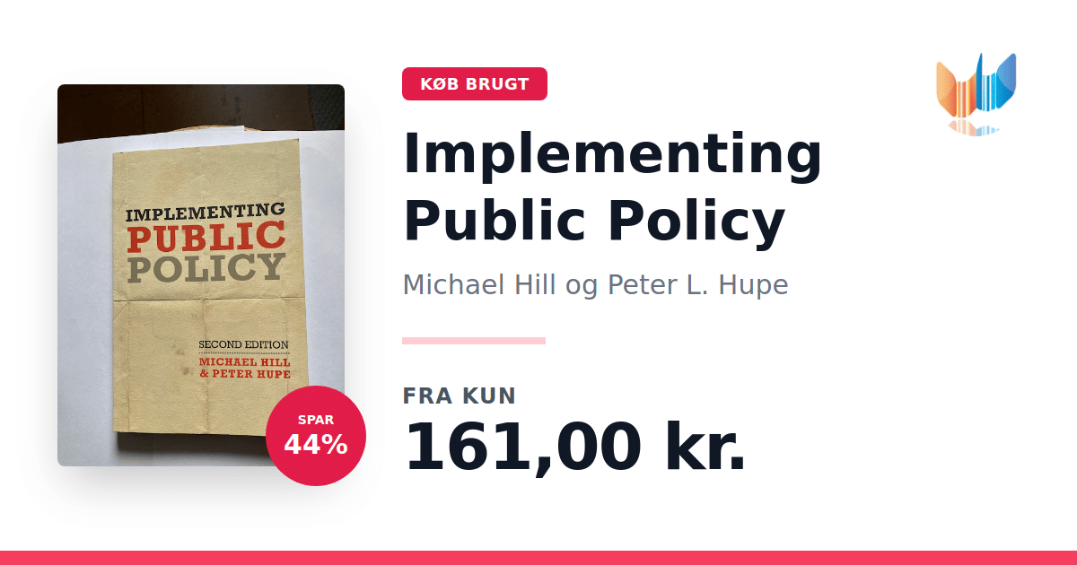 Lige nu kan du købe "Implementing Public Policy" af Michael Hill og Peter L. Hupe til kun 161,00 kr. Du sparer hele 44% af nyprisen! Bogen du ser her er brugt, og i perfekt stand. Vi har i øjeblikket kun et enkelt eksemplar til salg af "Implementing Public Policy", så slå til mens du kan!