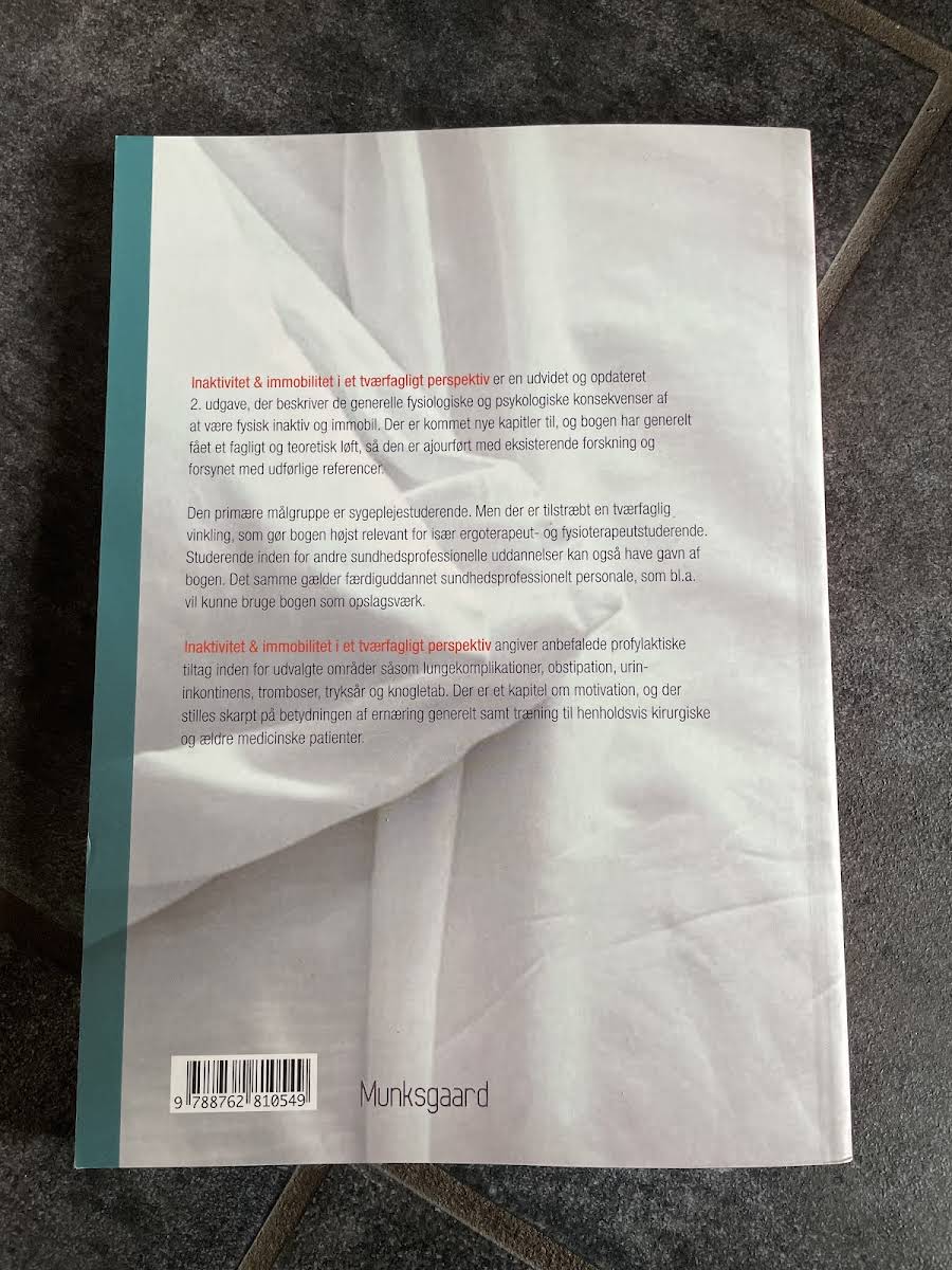 In "Inaktivitet og immobilitet i tværfagligt perspektiv" undersøges de fysiologiske og psykologiske konsekvenser af fysisk inaktivitet og immobilitet ud fra et alsidigt, tværfagligt perspektiv. Bogen afdækker aktuelle emner som lungekomplikationer, tryksår og knogletab, og giver desuden indblik i forebyggende tiltag, der kan have betydning for både kirurgiske og ældre medicinske patienter. Med sin opdaterede teoretiske tilgang og omfattende referencer er bogen ajourført med den nyeste forskning på området. Med udgangspunkt i en målgruppe, der primært omfatter sygeplejestuderende, er bogen struktureret, så den også henvender sig til faggrupper som ergoterapeuter og fysioterapi-studerende. Derudover kan både studerende og allerede uddannede sundhedsprofessionelle drage fordel af den tværfaglige vinkel, der sætter fokus på motivasjon samt ernæringens og træningens betydning i forbindelse med inaktivitet og immobilitet. Gyldendal udgiver denne 230-siders paperback fra 2010, der udgør et værdifuldt opslagsværk inden for sit felt.