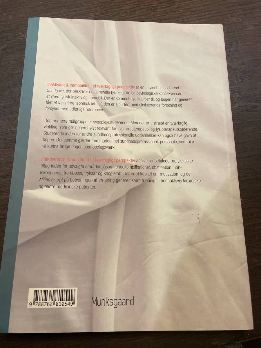 In "Inaktivitet og immobilitet i tværfagligt perspektiv" undersøges de fysiologiske og psykologiske konsekvenser af fysisk inaktivitet og immobilitet ud fra et alsidigt, tværfagligt perspektiv. Bogen afdækker aktuelle emner som lungekomplikationer, tryksår og knogletab, og giver desuden indblik i forebyggende tiltag, der kan have betydning for både kirurgiske og ældre medicinske patienter. Med sin opdaterede teoretiske tilgang og omfattende referencer er bogen ajourført med den nyeste forskning på området. Med udgangspunkt i en målgruppe, der primært omfatter sygeplejestuderende, er bogen struktureret, så den også henvender sig til faggrupper som ergoterapeuter og fysioterapi-studerende. Derudover kan både studerende og allerede uddannede sundhedsprofessionelle drage fordel af den tværfaglige vinkel, der sætter fokus på motivasjon samt ernæringens og træningens betydning i forbindelse med inaktivitet og immobilitet. Gyldendal udgiver denne 230-siders paperback fra 2010, der udgør et værdifuldt opslagsværk inden for sit felt.