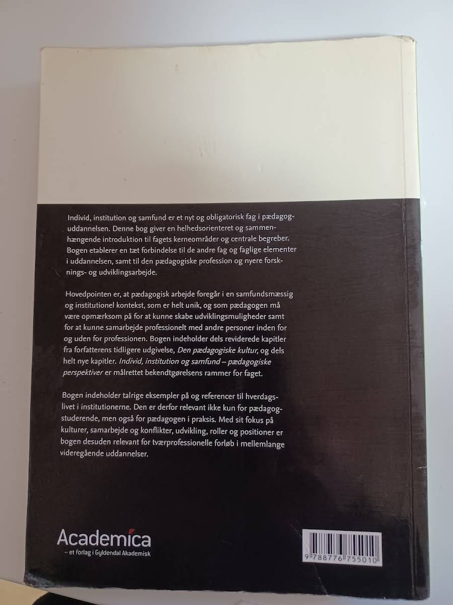 Individ, institution og samfund af Susanne Idun Mørch er en grundbog, der introducerer de centrale pædagogiske perspektiver i et fag, der har en nøglerolle på pædagoguddannelsen. Bogen giver en helhedsorienteret tilgang til de teoretiske og praktiske aspekter, der kendetegner samspillet mellem individet, institutionen og samfundet. Med et solidt fundament og et klart fokus på forbindelse mellem teori og praksis, belyser bogen, hvordan pædagogisk arbejde udfolder sig i unikke kontekster. Den præsenterer både opdaterede kapitler og nye perspektiver, der sammen understøtter fagets relevans i en moderne pædagogisk undervisning.