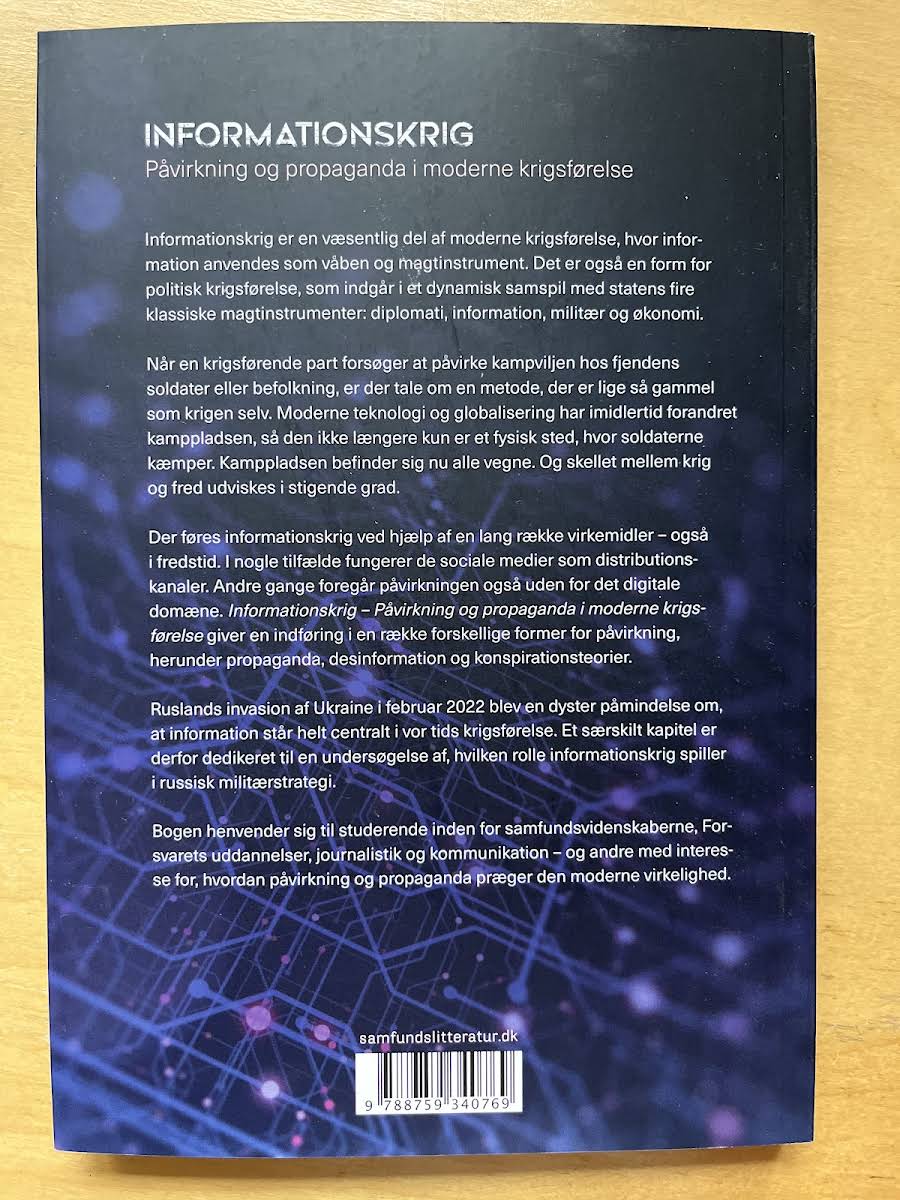 Informationskrig sætter fokus på, hvordan information anvendes som et magtfuldt våben i moderne konflikter. Bogen udforsker, hvordan informationspåvirkning og propaganda bliver integrerede elementer i den politiske krigsførelse, hvor traditionel militærstrategi kombineres med kommunikations- og teknologiværktøjer. Jeanette Serritzlev kombinerer viden fra kommunikation, international politik, historie og teknologi for at give en nuanceret introduktion til emnet. Med fokus på, hvordan statens fire magtinstrumenter – diplomati, information, militær og økonomi – indgår i denne form for krigsførelse, analyseres forskellige virkemidler, fra digitale distributionskanaler til mere traditionelle metoder til at styre kampviljen hos modstandere. Bogen tilbyder en skarp indsigt i de strategiske spil, der udspiller sig på både fysiske og digitale slagmarker. Ved at belyse eksempler som de kontrasterende kommunikationsstrategier hos involverede parter, understreges den centrale betydning af informationskrig i nutidens globale sikkerhedspolitik. Informationskrig er et værktøj, der ikke blot omdefinerer kamppladsen, men også udvisker grænserne mellem krig og fred. Denne første udgave giver læseren et solidt fundament til at forstå, hvordan påvirkning og propaganda former den moderne virkelighed.