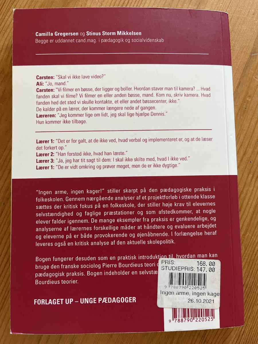 "Ingen arme, ingen kager!" stiller skarpt på den pædagogiske praksis i folkeskolen, hvor kravene til elevernes selvstændighed og faglige præstationer ofte giver anledning til uventede udfordringer. Bogen trækker på konkrete eksempler fra et projektforløb i ottende klasse, hvor lærernes forskellige tilgange til evaluering og håndtering af undervisningen bringes i spil. Dette giver læseren et nuanceret billede af, hvordan visse aspekter af skolepolitikken kan medføre, at nogle elever falder igennem systemet. Gennem indsigtsfulde analyser leverer Camilla Gregersen og Stinus Storm Mikkelsen en kritisk diskussion af den aktuelle skolepolitik og dens konsekvenser for den pædagogiske praksis. Bogen fungerer desuden som en introduktion til anvendelsen af den franske sociolog Pierre Bourdieus teorier og metoder, hvilket giver både teoretiske og praktiske perspektiver på, hvordan man kan forstå og udvikle undervisningsmiljøet. Med sin kombination af dybdegående casestudier og teoretiske input, inviterer "Ingen arme, ingen kager!" til refleksion over og fornyelse af skolens praksisser.