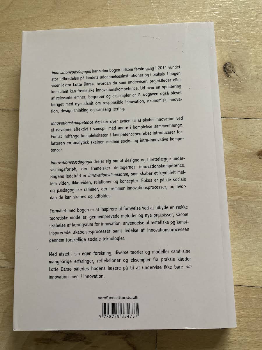 Innovationspædagogik – kunsten at fremelske innovationskompetence – er i sin 2. udgave en opdateret og udvidet guide, der henvender sig til undervisere, projektledere og konsulenter. Med udgangspunkt i forfatter Lotte Darsø’s dybdegående forskning og mangeårige erfaringer, bliver du præsenteret for velafprøvede metoder og friske teoretiske modeller, der understøtter udviklingen af innovationskompetence i komplekse læringssituationer. Bogen introducerer en række nye emner som responsible innovation, økonomisk innovation, design thinking og sanselig læring, som bidrager til en nuanceret forståelse af innovationsprocessens mange facetter. Gennem en analytisk differentiering mellem socio- og intrainnovative kompetencer og med fokus på de sociale og pædagogiske rammer, udfordrer Lotte Darsø læseren til at skabe læringsrum, hvor innovation kan blomstre.