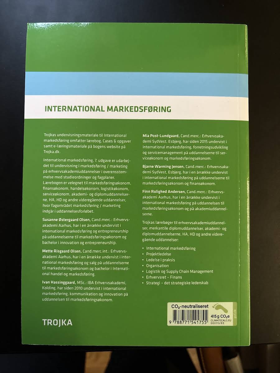 International markedføring, 7. udgave er specielt udarbejdet til undervisning på erhvervsakademiuddannelser samt andre videregående uddannelser, hvor markedsføring indgår som centralt emne. Bogen henvender sig til studieretninger som markedsføringsøkonom, finansøkonom, handelsøkonom, logistikøkonom, serviceøkonom samt akademi- og diplomuddannelserne, og kombinerer teori med praksis. Lærebogen kommer med en opgavesamling fyldt med cases og opgaver, der understøtter og perspektiverer bogens centrale emner. Eksempelvis illustreres sammenhængen mellem de teoretiske emner og virksomhedens markedsføringsproces gennem figurer, der gør stoffet mere tilgængeligt for både studerende og undervisere. Undervisningen suppleres desuden af e-læringsmateriale tilgængeligt via Trojkas hjemmeside, hvor der kan downloades PowerPoint-præsentationer med alle bogens figurer. For undervisere tilbydes desuden vejledninger til løsning af cases og opgaver efter anmodning. Trojka har udgivet denne 7. udgave i 2023 med en robust indbinding og 350 sider, som tilsammen udgør et uvurderligt redskab i studiet af international markedsføring.