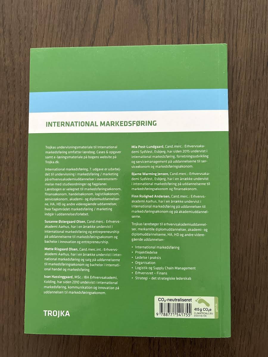 International markedføring, 7. udgave er specielt udarbejdet til undervisning på erhvervsakademiuddannelser samt andre videregående uddannelser, hvor markedsføring indgår som centralt emne. Bogen henvender sig til studieretninger som markedsføringsøkonom, finansøkonom, handelsøkonom, logistikøkonom, serviceøkonom samt akademi- og diplomuddannelserne, og kombinerer teori med praksis. Lærebogen kommer med en opgavesamling fyldt med cases og opgaver, der understøtter og perspektiverer bogens centrale emner. Eksempelvis illustreres sammenhængen mellem de teoretiske emner og virksomhedens markedsføringsproces gennem figurer, der gør stoffet mere tilgængeligt for både studerende og undervisere. Undervisningen suppleres desuden af e-læringsmateriale tilgængeligt via Trojkas hjemmeside, hvor der kan downloades PowerPoint-præsentationer med alle bogens figurer. For undervisere tilbydes desuden vejledninger til løsning af cases og opgaver efter anmodning. Trojka har udgivet denne 7. udgave i 2023 med en robust indbinding og 350 sider, som tilsammen udgør et uvurderligt redskab i studiet af international markedsføring.