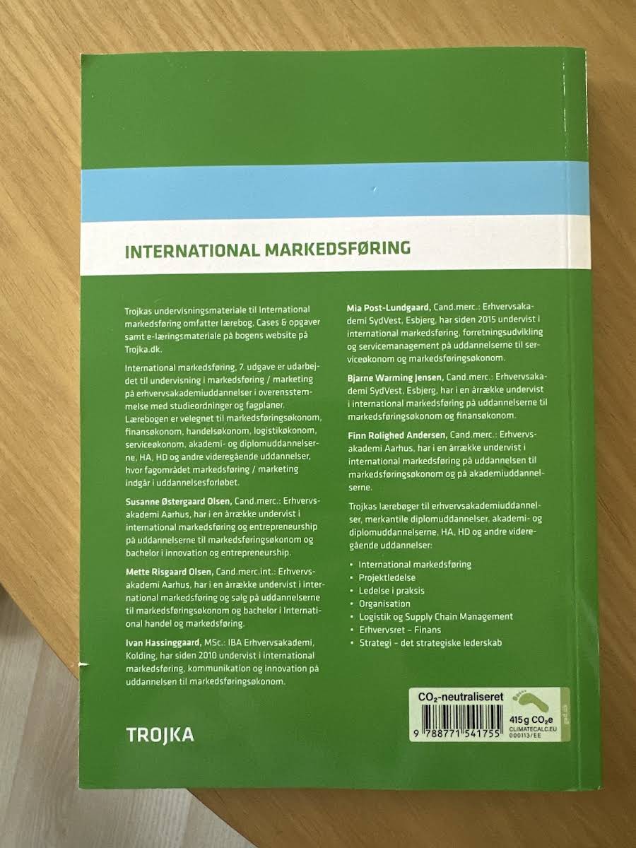 International markedføring, 7. udgave er specielt udarbejdet til undervisning på erhvervsakademiuddannelser samt andre videregående uddannelser, hvor markedsføring indgår som centralt emne. Bogen henvender sig til studieretninger som markedsføringsøkonom, finansøkonom, handelsøkonom, logistikøkonom, serviceøkonom samt akademi- og diplomuddannelserne, og kombinerer teori med praksis. Lærebogen kommer med en opgavesamling fyldt med cases og opgaver, der understøtter og perspektiverer bogens centrale emner. Eksempelvis illustreres sammenhængen mellem de teoretiske emner og virksomhedens markedsføringsproces gennem figurer, der gør stoffet mere tilgængeligt for både studerende og undervisere. Undervisningen suppleres desuden af e-læringsmateriale tilgængeligt via Trojkas hjemmeside, hvor der kan downloades PowerPoint-præsentationer med alle bogens figurer. For undervisere tilbydes desuden vejledninger til løsning af cases og opgaver efter anmodning. Trojka har udgivet denne 7. udgave i 2023 med en robust indbinding og 350 sider, som tilsammen udgør et uvurderligt redskab i studiet af international markedsføring.