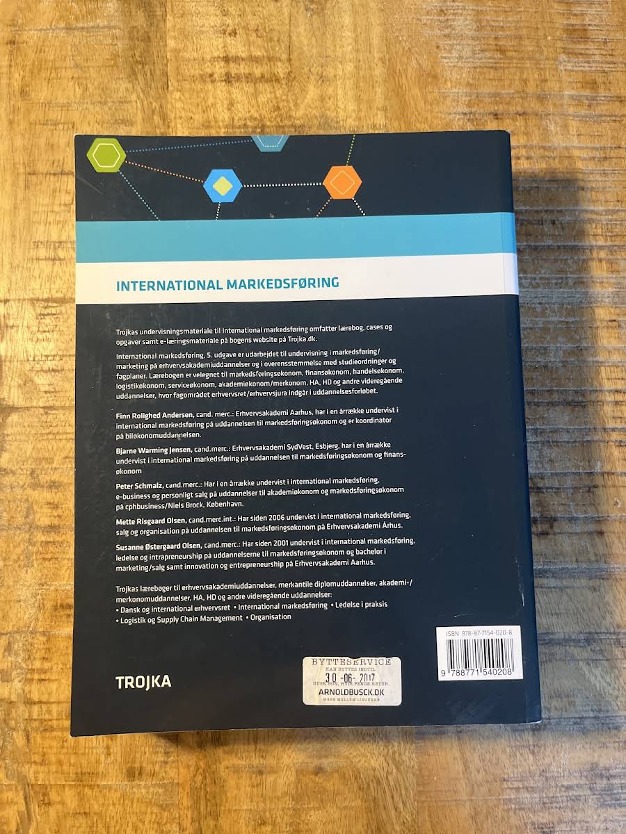 International markedsføring, 5. udgave, er en grundlæggende lærebog, der er udarbejdet med henblik på undervisningen på erhvervsakademiuddannelser samt på videregående uddannelser, hvor fagområdet markedsføring indgår. Bogen er nøje tilpasset studieordninger og fagplaner og danner grundlaget for en dybdegående forståelse af internationale markedsføringsstrategier og -teorier. I denne udgave er der foretaget en række opdateringer, hvor de nyeste udviklingstendenser og teorier er inddraget. Lærebogen indeholder et bredt spektrum af modeller og metoder, som giver de studerende redskaberne til at forstå og anvende markedsføring i en global kontekst. Med sin solide teori og praktiske tilgang er bogen et uundværligt værktøj for alle, der ønsker en grundig indføring i international markedsføring.