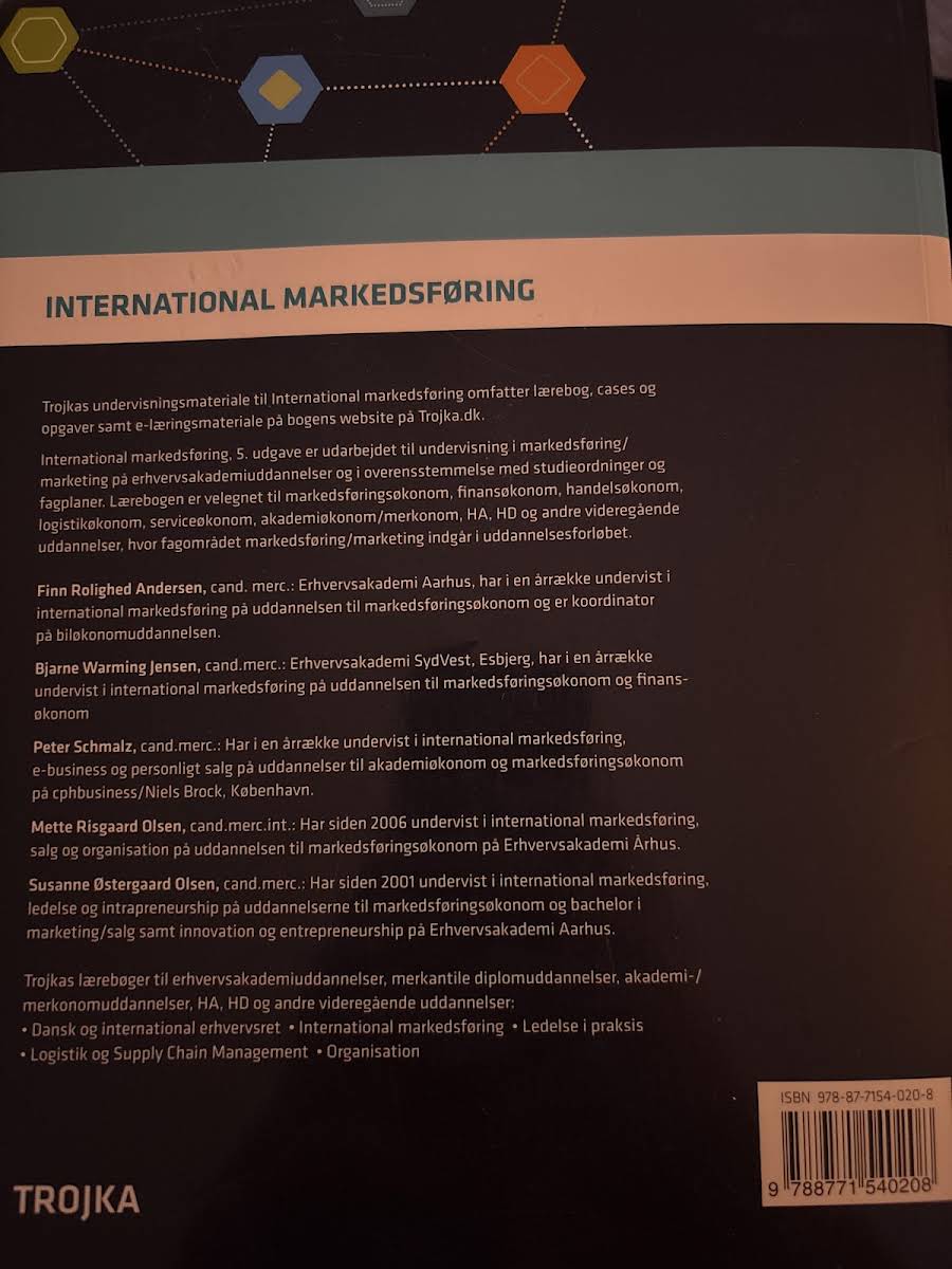 International markedsføring, 5. udgave, er en grundlæggende lærebog, der er udarbejdet med henblik på undervisningen på erhvervsakademiuddannelser samt på videregående uddannelser, hvor fagområdet markedsføring indgår. Bogen er nøje tilpasset studieordninger og fagplaner og danner grundlaget for en dybdegående forståelse af internationale markedsføringsstrategier og -teorier. I denne udgave er der foretaget en række opdateringer, hvor de nyeste udviklingstendenser og teorier er inddraget. Lærebogen indeholder et bredt spektrum af modeller og metoder, som giver de studerende redskaberne til at forstå og anvende markedsføring i en global kontekst. Med sin solide teori og praktiske tilgang er bogen et uundværligt værktøj for alle, der ønsker en grundig indføring i international markedsføring.