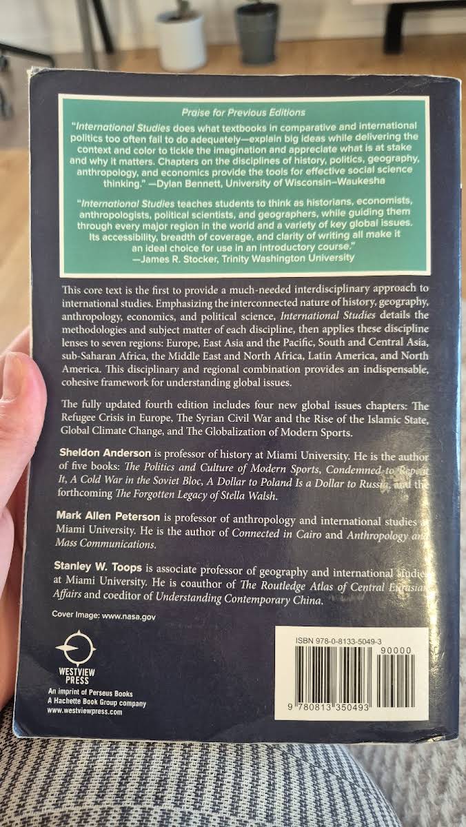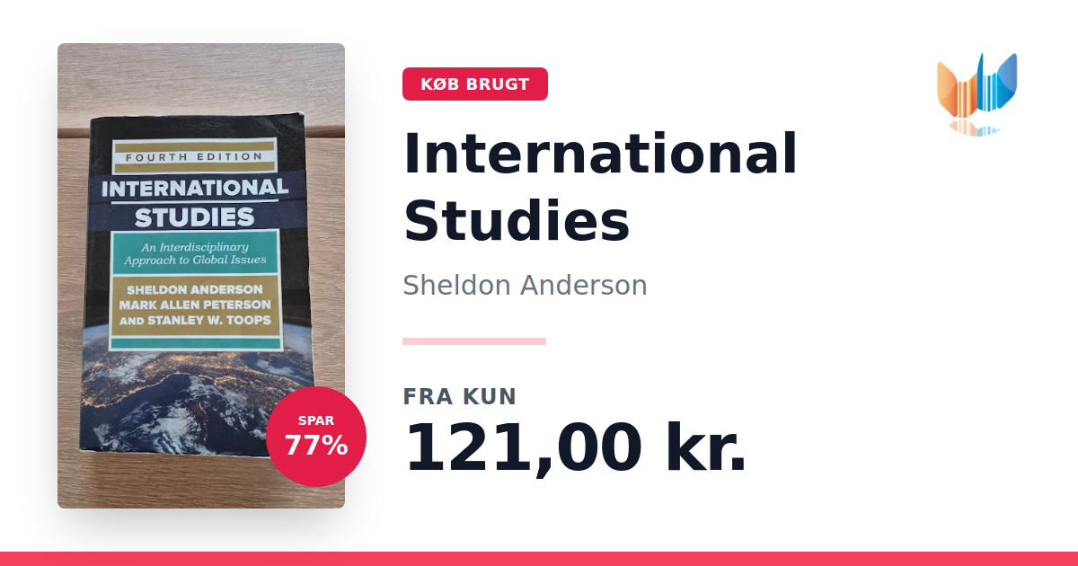 International Studies: An Interdisciplinary Approach to Global Issues er en grundlæggende lærebog, der præsenterer en helhedsorienteret, tværfaglig tilgang til globale anliggender. Bogen er skrevet af Sheldon Anderson, Mark Allen Peterson og Stanley W. Toops og udkom i 2017 som fjerde udgave på Routledge. Ved at samle historie, geografi, antropologi, økonomi og statskundskab giver værket en dybdegående indføring i metoder og nøglebegreber for hver disciplin. Dernæst anvendes disse perspektiver på syv regioner: Europa; Østasien og Stillehavsområdet; Syd- og Centralasien; Subsaharisk Afrika; Mellemøsten og Nordafrika; Latinamerika; samt Nordamerika. Den unikke kombination af disciplinære analyser og regionalt fokus skaber et sammenhængende rammeværk til at forstå nutidens globale problemstillinger. International Studies er derfor uundværlig for studerende og undervisere, der ønsker at kortlægge og sammenligne de kræfter, der former verden i dag. I denne fuldt opdaterede fjerde udgave tilføjes fire nye kapitler om aktuelle globale udfordringer: flygtningekrisen i Europa, den syriske borgerkrig og fremvæksten af Islamisk Stat, global klimaforandring samt globaliseringen af moderne sport. With 512 sider i paperback udgave giver bogen et aktuelt, omfattende overblik over internationale studier.
