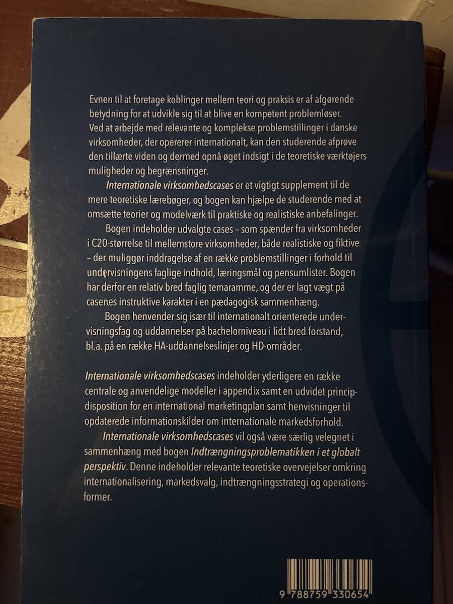 Bogen Internationale virksomhedscases giver studerende mulighed for at omsætte teoretiske koncepter til praksis ved at dykke ned i udvalgte cases fra danske virksomheder, der opererer internationalt. Denne tilgang styrker evnen til at identificere og løse komplekse problemstillinger under realistiske forhold og skaber en værdifuld bro mellem teori og praksis. Gennem en række cases, som spænder fra større til mellemstore virksomheder – både med realistiske og fiktive elementer – tilbyder bogen et alsidigt grundlag for at undersøge internationale forretningsstrategier. Casene er udvalgt med henblik på pædagogisk anvendelse og afprøvning af teoretiske modeller i en virksomhedsrelevant kontekst. Derudover indeholder bogen centrale modeller og et uddybende principudkast til en international marketingplan, der understøtter underviserens og den studerendes arbejde med komplekse teorier og metoder. Internationale virksomhedscases henvender sig primært til internationalt orienterede uddannelser inden for bl.a. HA- og HD-områder, hvor den bidrager til at skabe et solidt fundament for videre faglig udvikling.