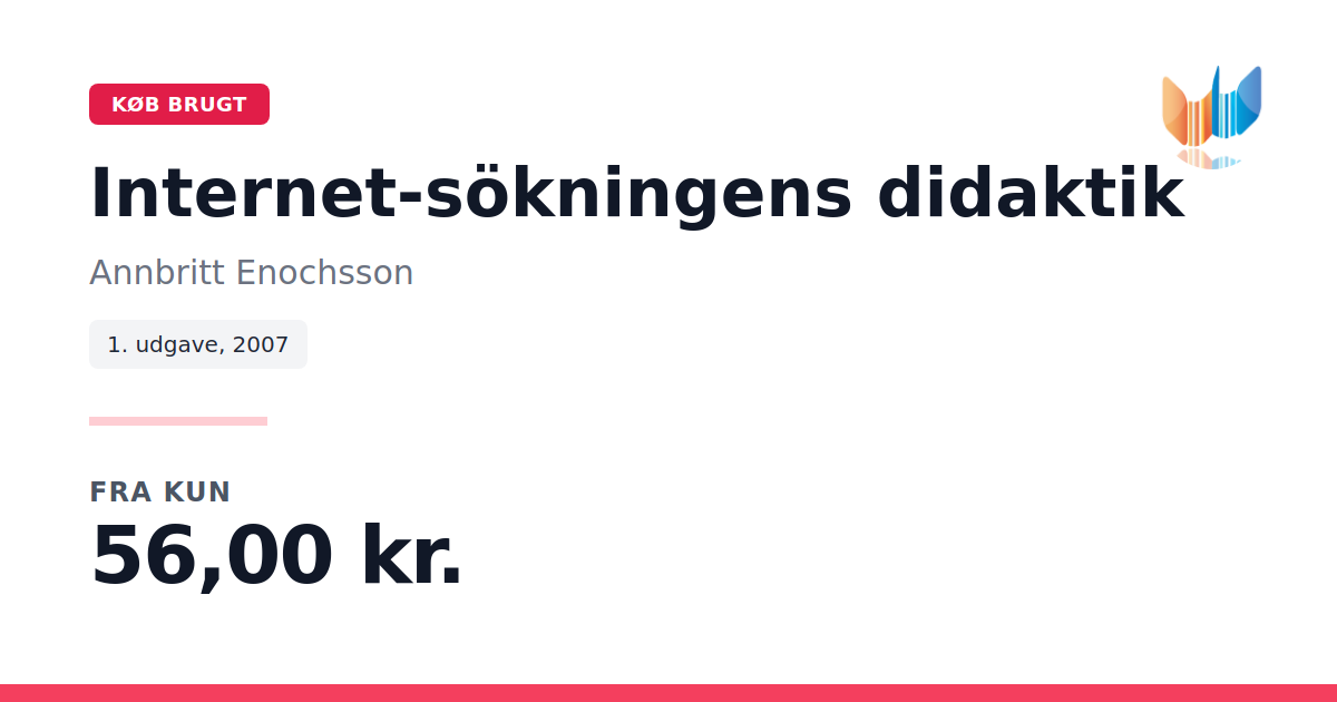 Lige nu kan du købe "Internet-sökningens didaktik" af Annbritt Enochsson til kun 56,00 kr. Bogen du ser her er brugt, og i perfekt stand. Vi har i øjeblikket 2 eksemplarer til salg af "Internet-sökningens didaktik", så husk at se de forskellige udgaver.