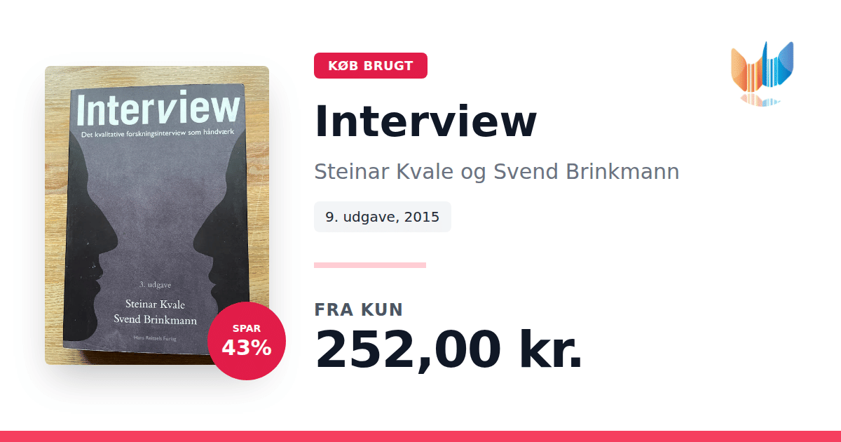 "Interview" af Steinar Kvale og Svend Brinkmann er en essentiel grundbog for studerende og forskere, der ønsker at mestre interviewets mange facetter. Bogen kombinerer en teoretisk forståelse med en praktisk tilgang, der tilsammen giver læseren en solid introduktion til interviewets udfordringer og muligheder. I denne tredje udgave, der udkom i 2015 hos Hans Reitzels Forlag, bliver du præsenteret for nye udviklingstendenser inden for kvalitativ interviewforskning. Med en klar og logisk opbygning bliver både de epistemologiske og etiske aspekter belyst, så du får redskaberne til at håndtere de mange former for spørgsmål og problemstillinger, der opstår i interviewprocessen. Bogens gennemarbejdede struktur og flydende sprog sikrer, at den forbliver en trofast følgesvend, uanset om du er nybegynder eller allerede arbejder med interviewteknikker. "Interview" udgør dermed ikke blot en teoretisk indføring, men også en praktisk guide til at udvikle dit håndværk og nå dine forskningsmål.