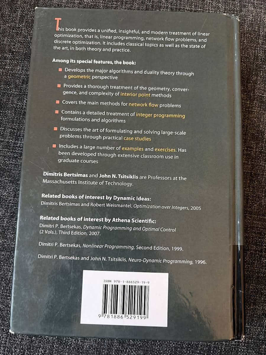 • Introduction to Linear Optimization, Dimitris Bertsimas, John N. Tsitsiklis, 9781886529199