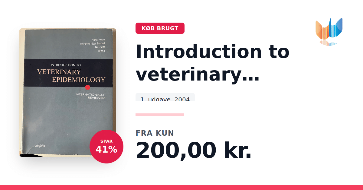 Lige nu kan du købe "Introduction to veterinary epidemiology" til kun 200,00 kr. Du sparer hele 41% af nyprisen! Bogen du ser her er brugt, og i perfekt stand. Vi har i øjeblikket kun et enkelt eksemplar til salg af "Introduction to veterinary epidemiology", så slå til mens du kan!