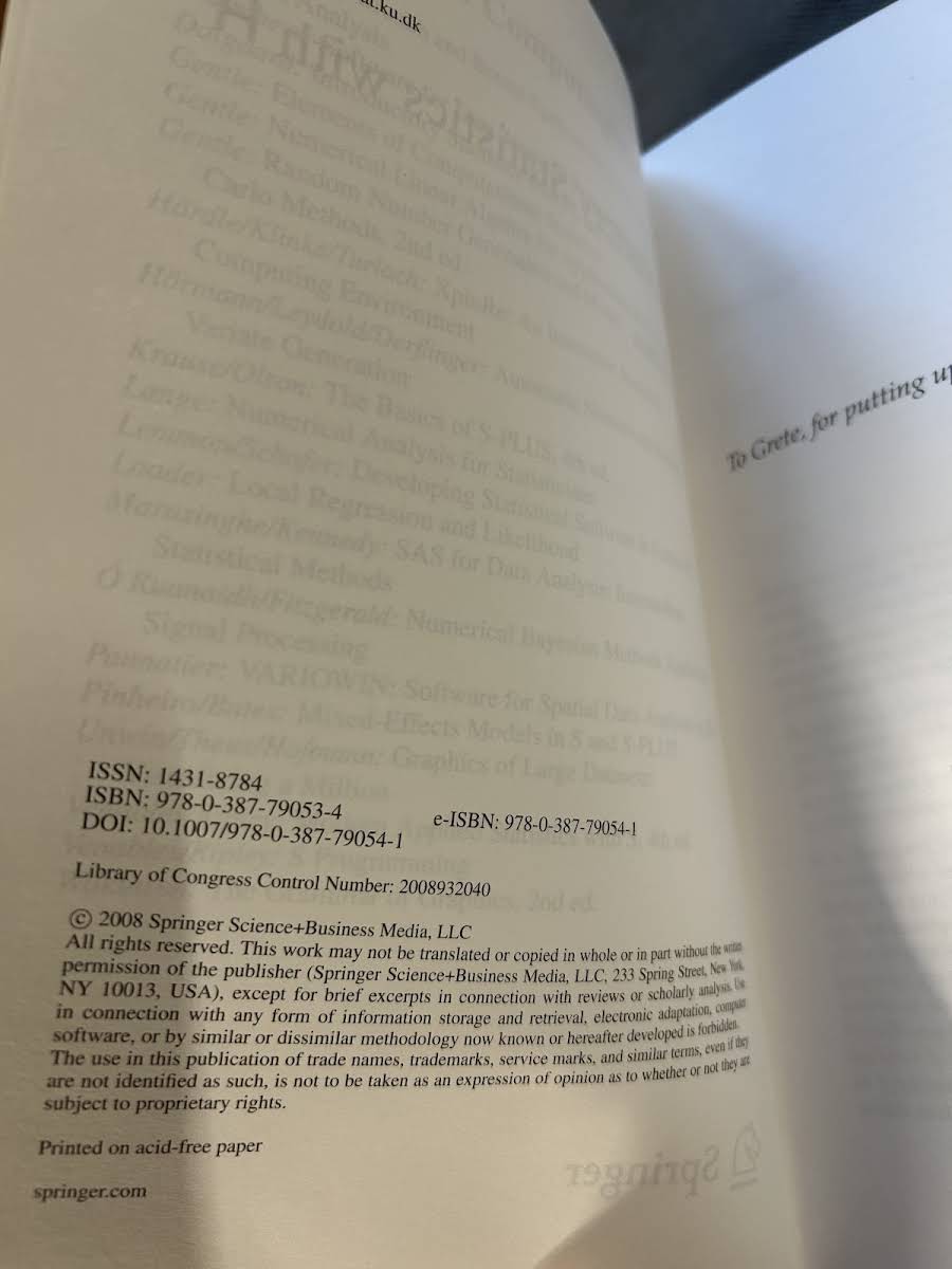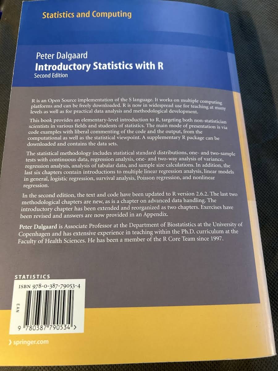 Introductory Statistics with R byder på en grundig, men tilgængelig introduktion til R for både natur- og samfundsvidenskabelige forskere uden statistisk baggrund samt for studerende i statistik. Bogen præsenterer hele stoffet gennem eksemplarisk kommenteret kode, hvor både beregningsmæssige og statistiske aspekter fremhæves. Inden hver metode præsenteres kortfattede afsnit, der giver en nødvendig teoretisk forankring. Alle eksempler kan køres direkte, og samtlige figurer genereres automatisk fra koden. Statistikken spænder over standardfordelinger, en- og to-prøvetests for kontinuerlige data, regressionsanalyse, en- og tovejssammenligninger (ANOVA), tabelanalyse og stikprøvestørrelsesberegning. Bogens sidste fire kapitler introducerer multiple lineære regressioner, generelle lineære modeller, logistisk regression samt overlevelsesanalyse. En tilhørende R-pakke med alle datasæt kan downloades gratis.