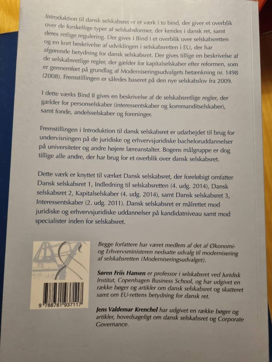 "Introduktion til dansk selskabsret – Personselskaber, foreninger og fonde" er den anden udgave af et centralt værk, der giver et solidt indblik i de retlige rammer for personerelaterede selskabsformer, foreninger og fonde. Bogen er nøje udformet med henblik på at give både studerende og andre interesserede en struktureret og overskuelig introduktion til emnet. Med en klar og pædagogisk fremstilling gennemgår forfatterne de væsentligste selskabsretlige regler og principper, der gælder for blandt andet interessentskaber, kommanditselskaber, andelsselskaber samt de specifikke regler for foreninger og fonde. Værket er tilpasset undervisningen på juridiske og erhvervsjuridiske bacheloruddannelser, men det giver også en værdifuld introduktion for alle, der ønsker et overblik over dansk selskabsret. Med autoriteter som Søren Friis Hansen og Jens Valdemar Krenchel bag bogen sikres læseren en dybdegående og opdateret behandling af faget, idet indholdet afspejler både aktuelle retsregler og de teoretiske overvejelser, der præger moderne selskabsret.