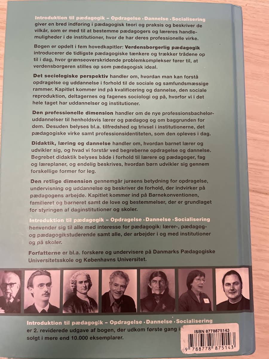 Introduktion til pædagogik - Opdragelse, Dannelse, Socialisering giver en omfattende indføring i både pædagogisk teori og praksis og tydeliggør de rammer, som former læreres og pædagogers handlemuligheder i daginstitutioner og skoler. Med en klar tilgang til både historiske og moderne problemstillinger fremhæver bogen, hvordan pædagogisk arbejde tager afsæt i komplekse samfundsforhold og globale udfordringer. Bogen er inddelt i fem hoveddele: Verdensborgerlig pædagogik tager læseren fra klassiske tænkere til nutidens ideal om verdensborgeren som pædagogisk mål. Det sociologiske perspektiv ser på opdragelse og uddannelse i sociale og samfundsmæssige rammer med fokus på kvalificering, dannelse og social reproduktion. Den professionelle dimension behandler professionsbacheloruddannelserne, trivsel, tilfredshed og professionsidentitet. Didaktik, læring og dannelse undersøger, hvordan børn lærer og udvikler sig, hvad opdragelse og dannelse indebærer, og hvordan legens former spiller en rolle. Den retlige dimension belyser juraens betydning for pædagogers arbejde gennem Børnekonventionen, familieret, børneret og styringslove for daginstitutioner og skoler. Introduktion til pædagogik henvender sig bredt til lærere, pædagog- og pædagogikstuderende samt alle, der arbejder i og med institutioner og skoler. Forfatterteamet består af forskere og undervisere fra Danmarks Pædagogiske Universitetsskole og Københavns Universitet, som tilsammen samler teoretisk tyngde og praktisk indsigt. Dette er 2. reviderede udgave fra 2008 - den oprindelige udgave udkom i 2001 og er solgt i mere end 10.000 eksemplarer. Hardcover-udgaven omfatter 639 sider fyldt med grundige analyser og praksisnære eksempler.