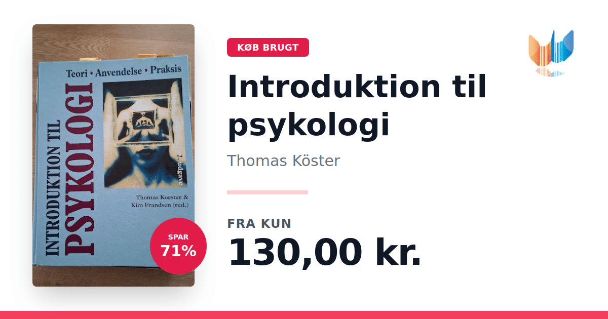 Lige nu kan du købe "Introduktion til psykologi" af Thomas Köster til kun 130,00 kr. Du sparer hele 71% af nyprisen! Bogen du ser her er brugt, og i god stand. Vi har i øjeblikket 8 eksemplarer til salg af "Introduktion til psykologi", så husk at se de forskellige udgaver.