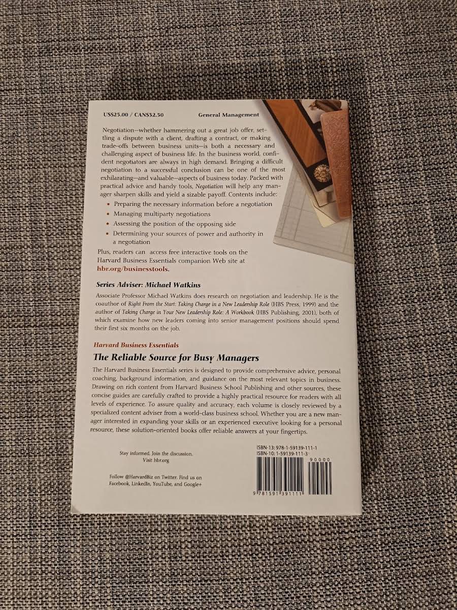 Negotiation – whether securing a promising job offer, resolving conflicts, formalizing deals, or balancing competing interests - is an essential yet challenging part of business life. This concise guide delivers practical advice and proven tools to help managers sharpen their skills and become more adept deal makers in any situation. Within its 192 pages, the book covers key aspects of the negotiation process, including the importance of thorough preparation, managing negotiations involving multiple parties, and accurately evaluating the opposing side's position. In addition, it provides insights into leveraging power and authority while identifying potential obstacles and strategies to overcome them. Published by Harvard Business Review Press in 2003, this paperback serves as a valuable resource for anyone seeking to elevate their negotiation capabilities.