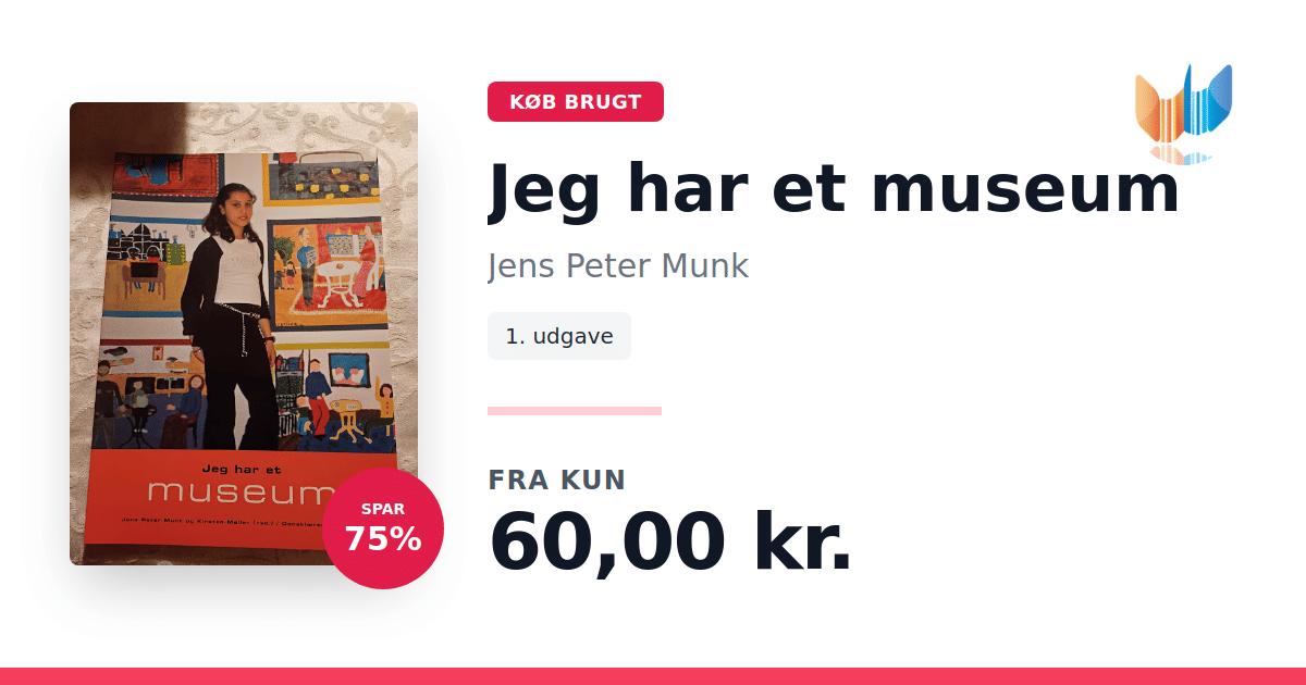 Lige nu kan du købe "Jeg har et museum" af Jens Peter Munk til kun 60,00 kr. Du sparer hele 75% af nyprisen! Bogen du ser her er brugt, og i perfekt stand. Vi har i øjeblikket kun et enkelt eksemplar til salg af "Jeg har et museum", så slå til mens du kan!